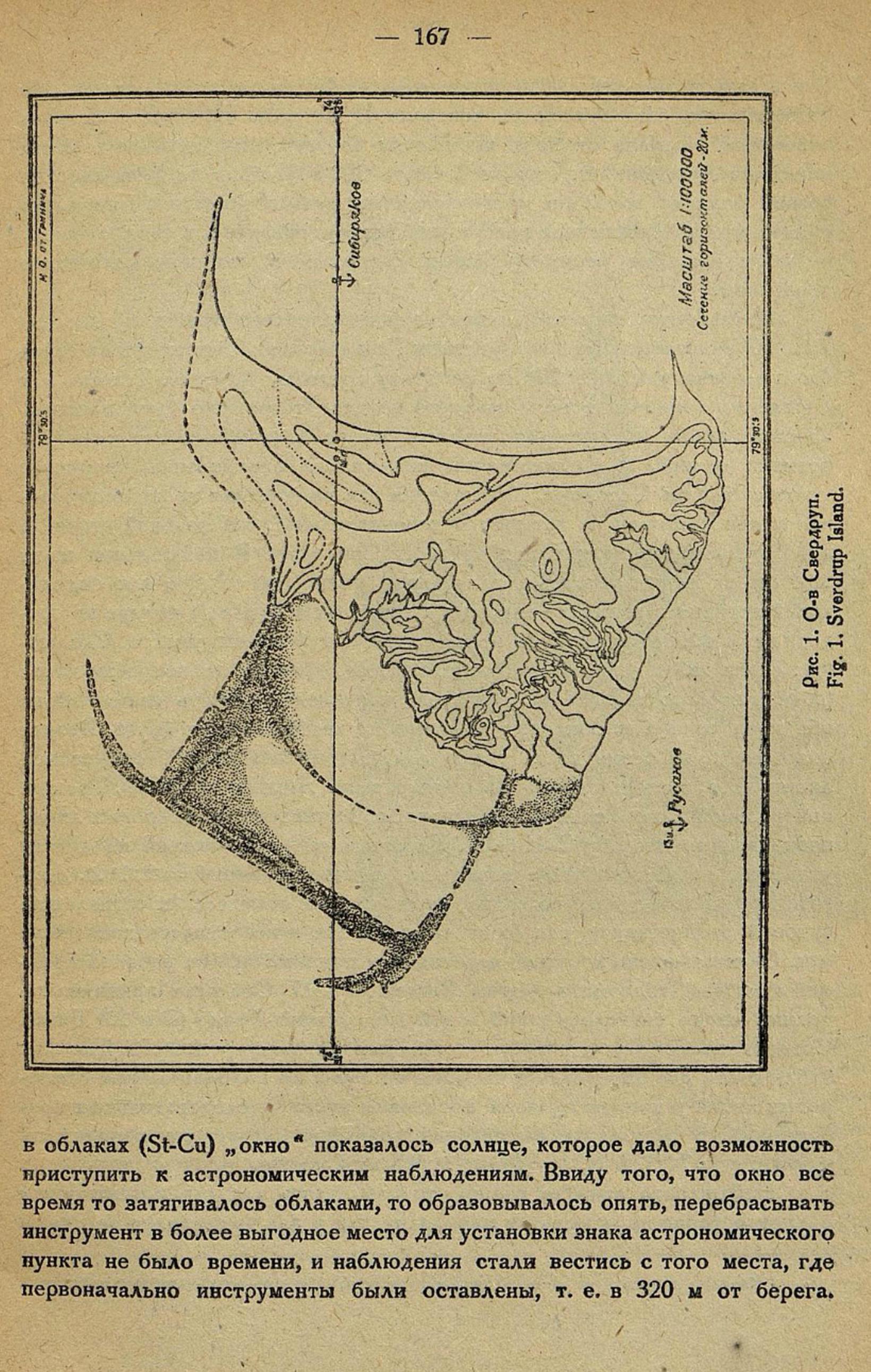 purpose the ice-breaker sailed there from Dickson Island. On August 8, 1932, the „Sibiriakov “-Expedition landed on Sverdrup Island, together with the Expedition on the ice-breaking cargo-steamer „V. Russanov", and in the space of but one day carried out a many-sided investigation of the island. Among the number of these works was the survey and determination of the astronomical point (74°32'6 N, 79°30'5 E. ) As a result of this survey, which was made simultaneously by both expeditions, a map of the island has'been compiled on the scale 1/100000. This map in its general features is similar to the configuration of the island as drawn, according to the sketch made by V. Verderevsky from the airplane „Komseverput № 2", which in 1930, while reconnoitring the ice-conditions in the Kara Sea, repeatedly flew over the island. The island, mapped, according to the coordinates of the astrono¬mical point, is displaced 9 miles to the SSW from its primary position on the map.