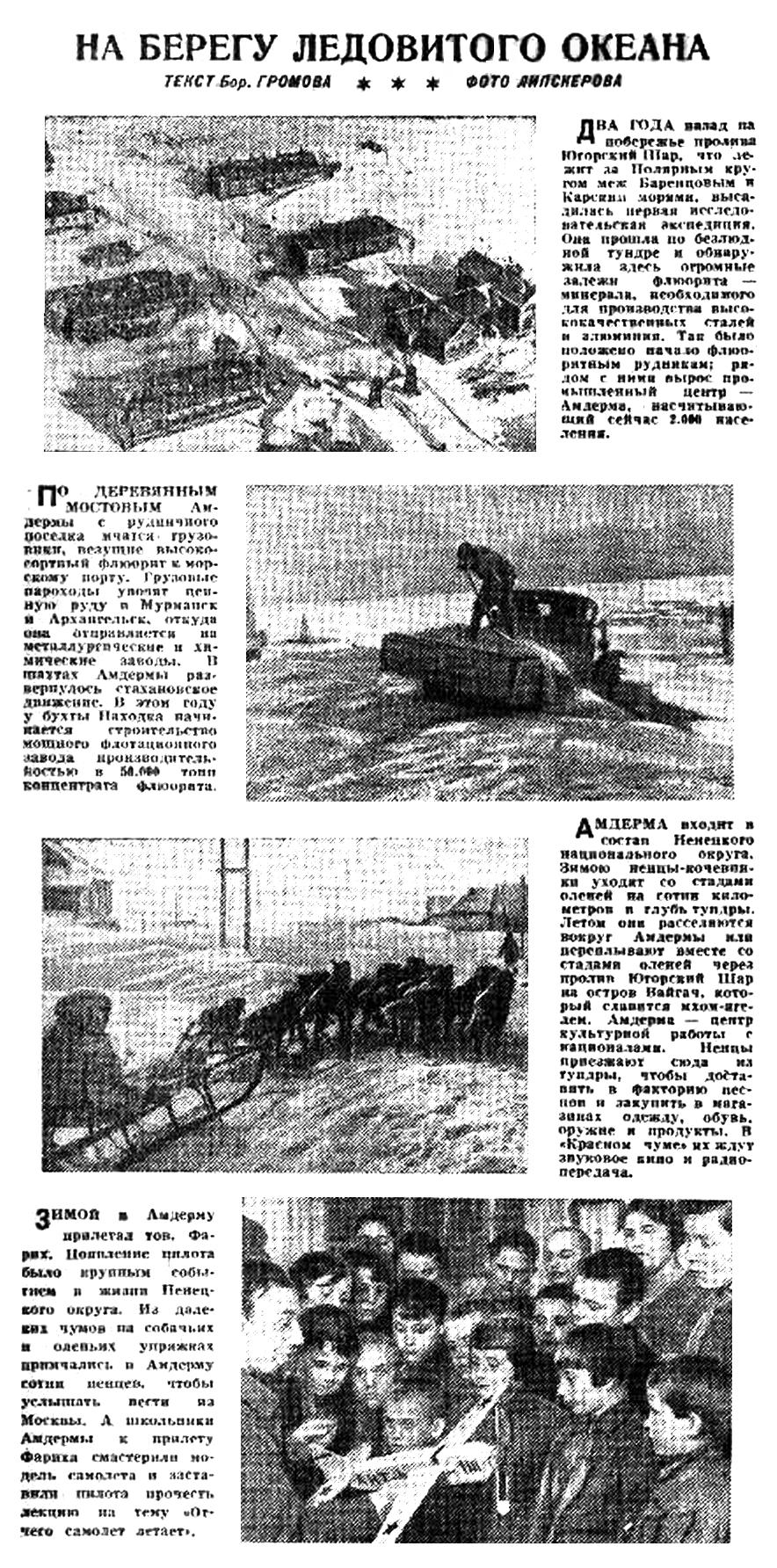 Зимой в Амдерму прилетал тов. Фарих. Появление пилота было крупным событием в жизни Ненецкого округа. Из далеких чумов на собачьих и оленьих упряжках примчались в Амдерму сотни ненцев, чтобы услышать вести из Москвы. А школьники Амдермы к прилету Фариха смастерили модель самолета и заставили пилота прочесть лекцию на тему «Отчего самолет летает».