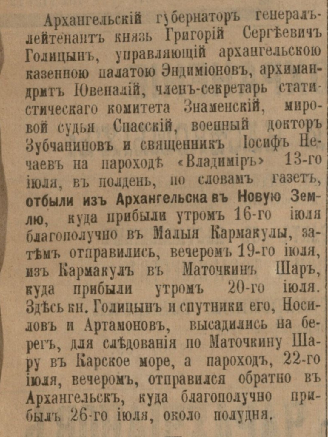 Архангельский губернаторъ генералъ-лейтенантъ князь Григорий Сергеевичъ Голицынъ, управляющий архангельскою казенною палатою Эндимионовъ, архимандритъ Ювеналий, членъ-севретарь статистическаго комитета Знаменский, мировой судья Спасский, военный докторъ Зубчаниновъ и священникъ Иосифъ Нечаевъ на пароходе «Владимиръ» 13 - го июля, въ полдень, по словамъ газетъ, отбыли изъ Архангельска въ Новую Землю, куда прибыли утромъ 16-го июля благополучно въ Малыя Кармакулы, затемъ отправились, вечеромъ 19-го июля, изъ Кармакулъ в Маточкинъ Шар, куда прибыли утромъ 20-го июля.