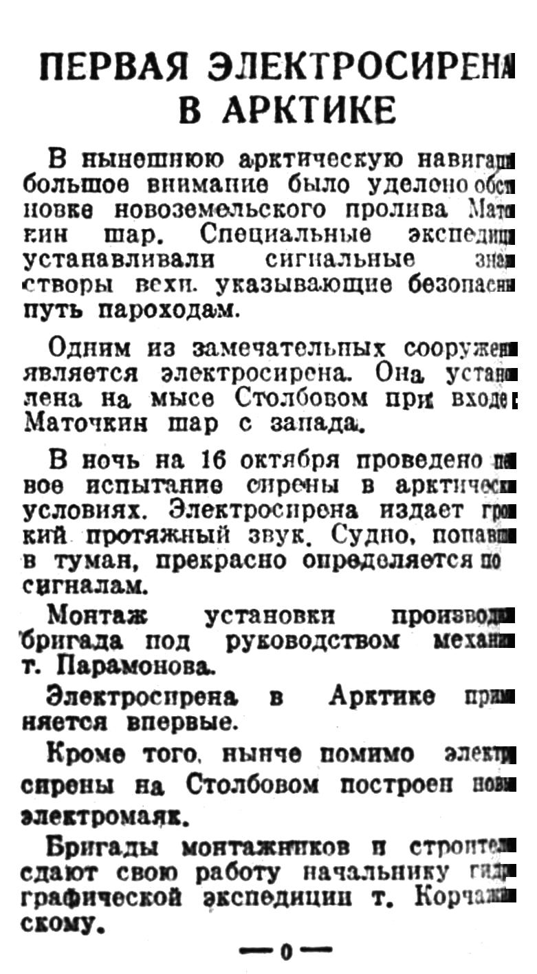 В ночь на 16 октября проведено первое испытание сирены в арктических условиях. Электросирена издает громкий протяжный звук. Судно, попавшее в туман, прекрасно определяется по ее сигналам.