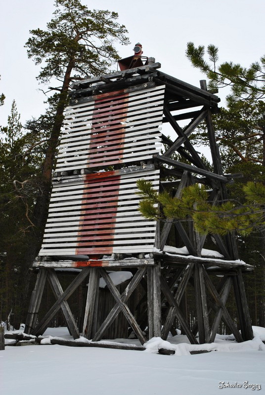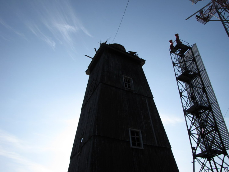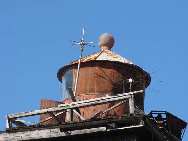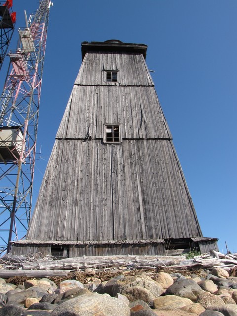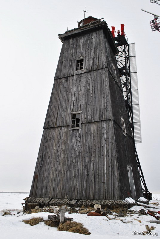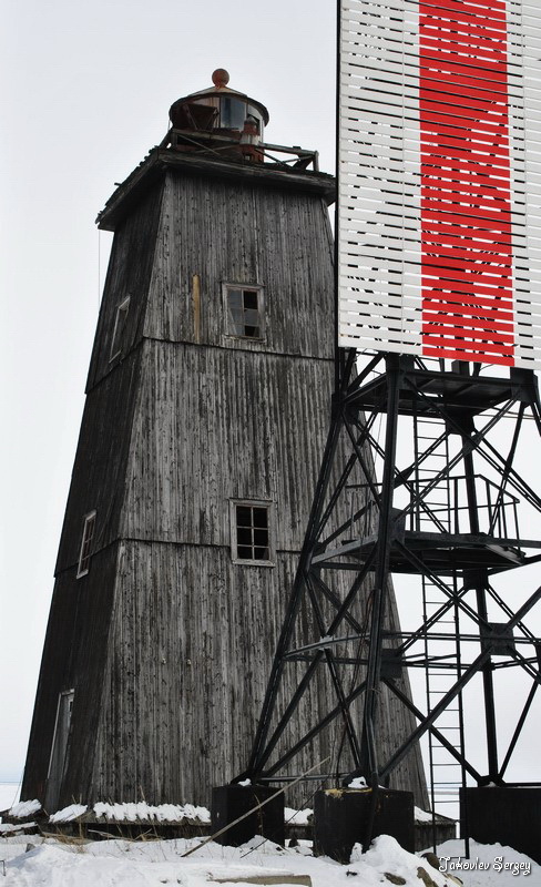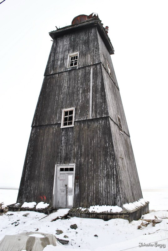 Башня деревянная, четырехсторонняя усеченная пирамида черного цвета и 51 фут высотою, на вершине ее установлен фонарь. Она стоит на песчаном бугре близ южной оконечности острова в 6 саженях от берега и в 200 саженях от поста пограничной стражи...