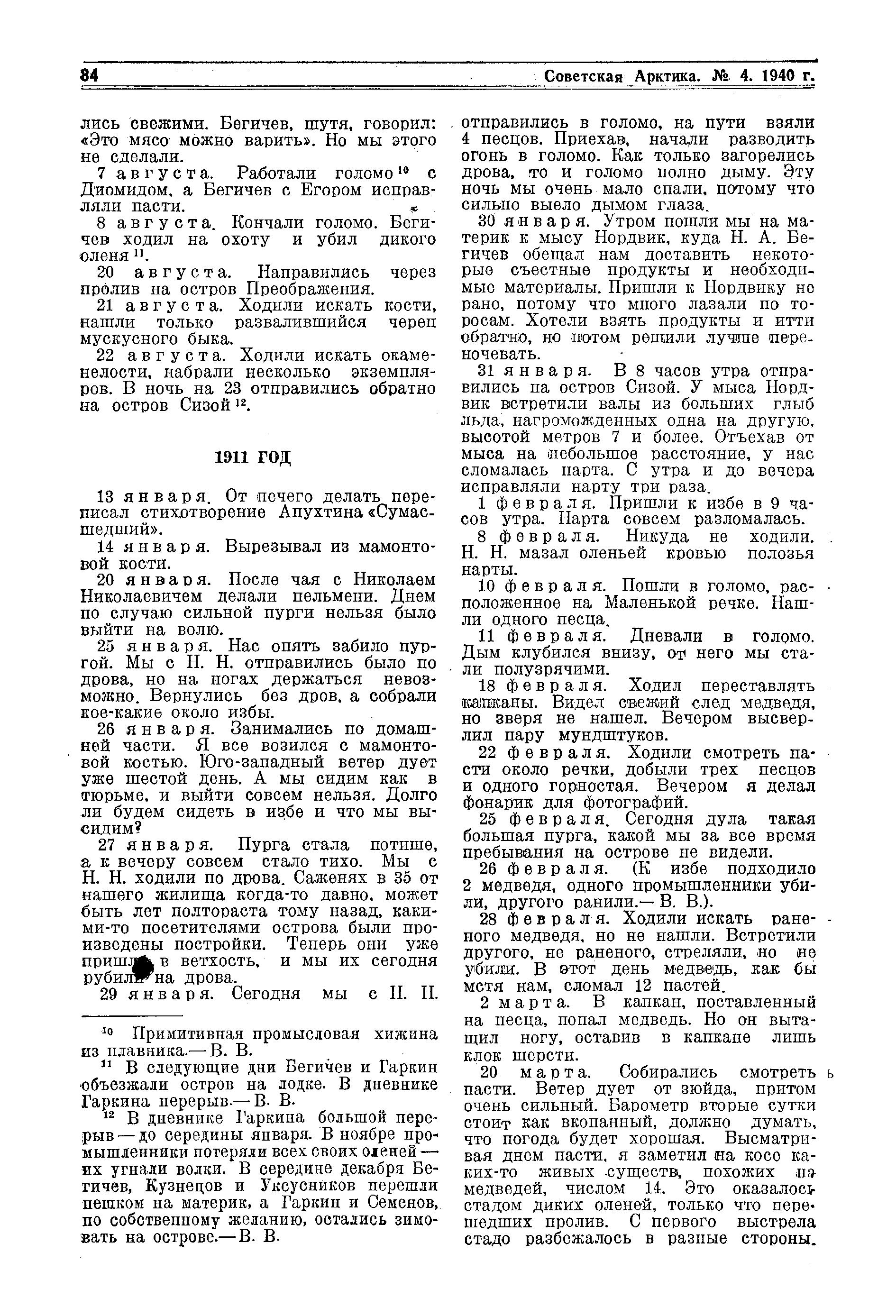 12) В дневнике Гаркина большой перерыв — до середины января. В ноябре промышленники потеряли всех своих оленей — их угнали волки. В середине декабря Бегичев, Кузнецов и Уксусников перешли пешком на материк, а Гаркин и Семенов, по собственному желанию, остались зимовать на острове. — В. В.