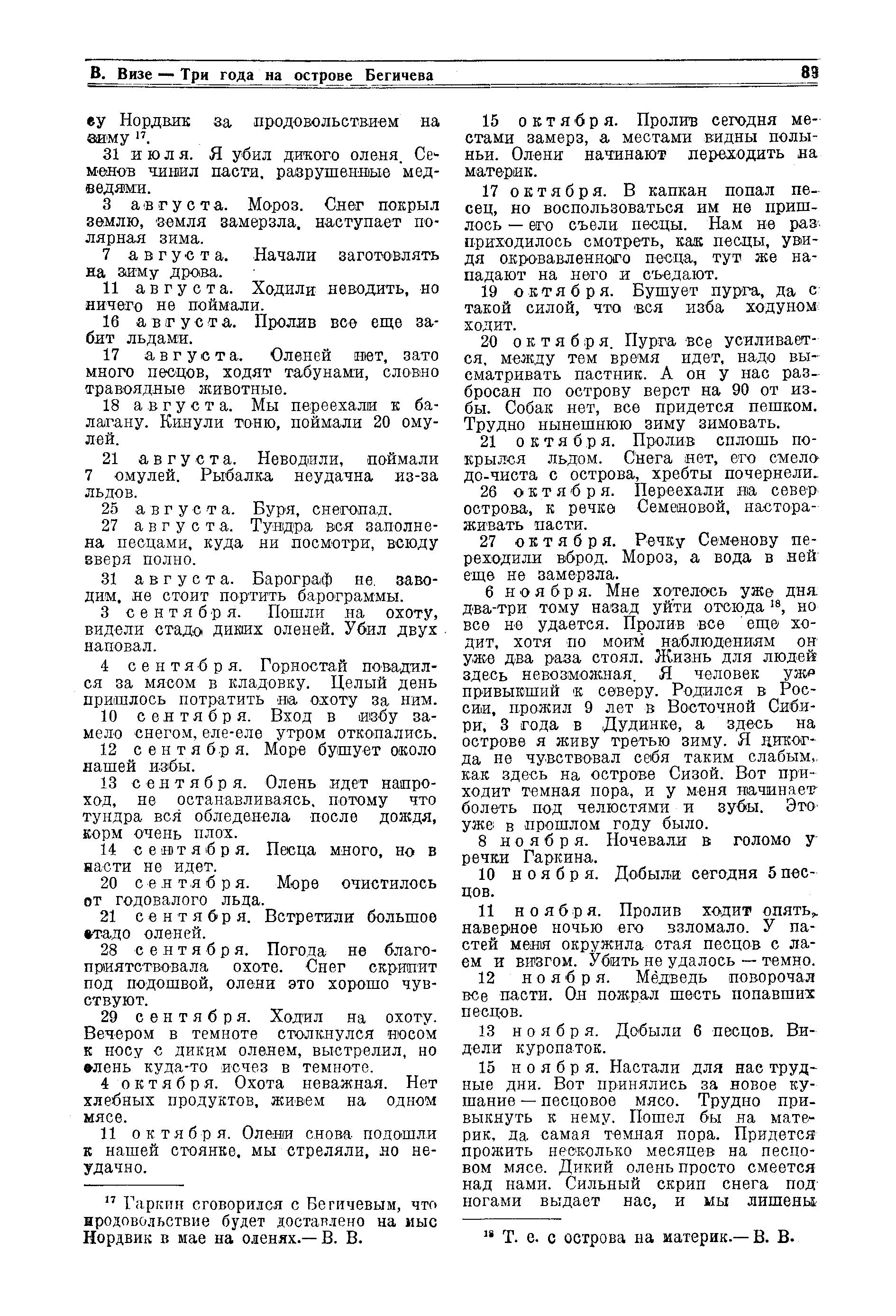 В дневнике Е. А. Гаркина, выдержки из которого публикуются. ниже 2), мы находим интересные описания жизни первых зимовщиков на острове Бегичева, ценные сведения о природе острова, его промысловой фауне, состоянии льдов, погоде и т. п.