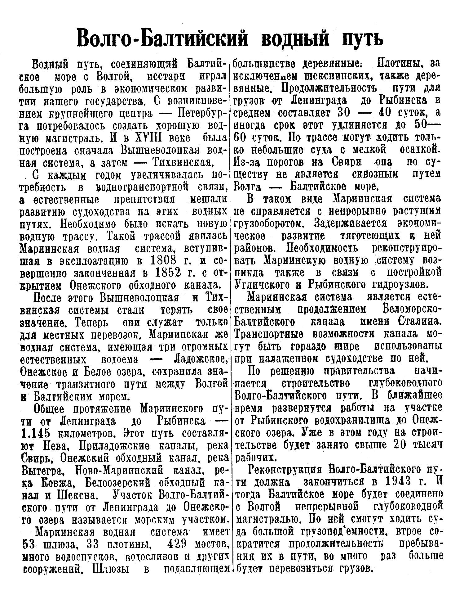 Реконструкция Волго-Балтийского пути должна закончиться в 1943 г. И тогда Балтийское море будет соединено с Волгой непрерывной глубоководной магистралью. По ней смогут ходить суда большой грузоподъемности. втрое сократится продолжительность пребывания их в пути, во много раз больше будет перевозиться грузов.