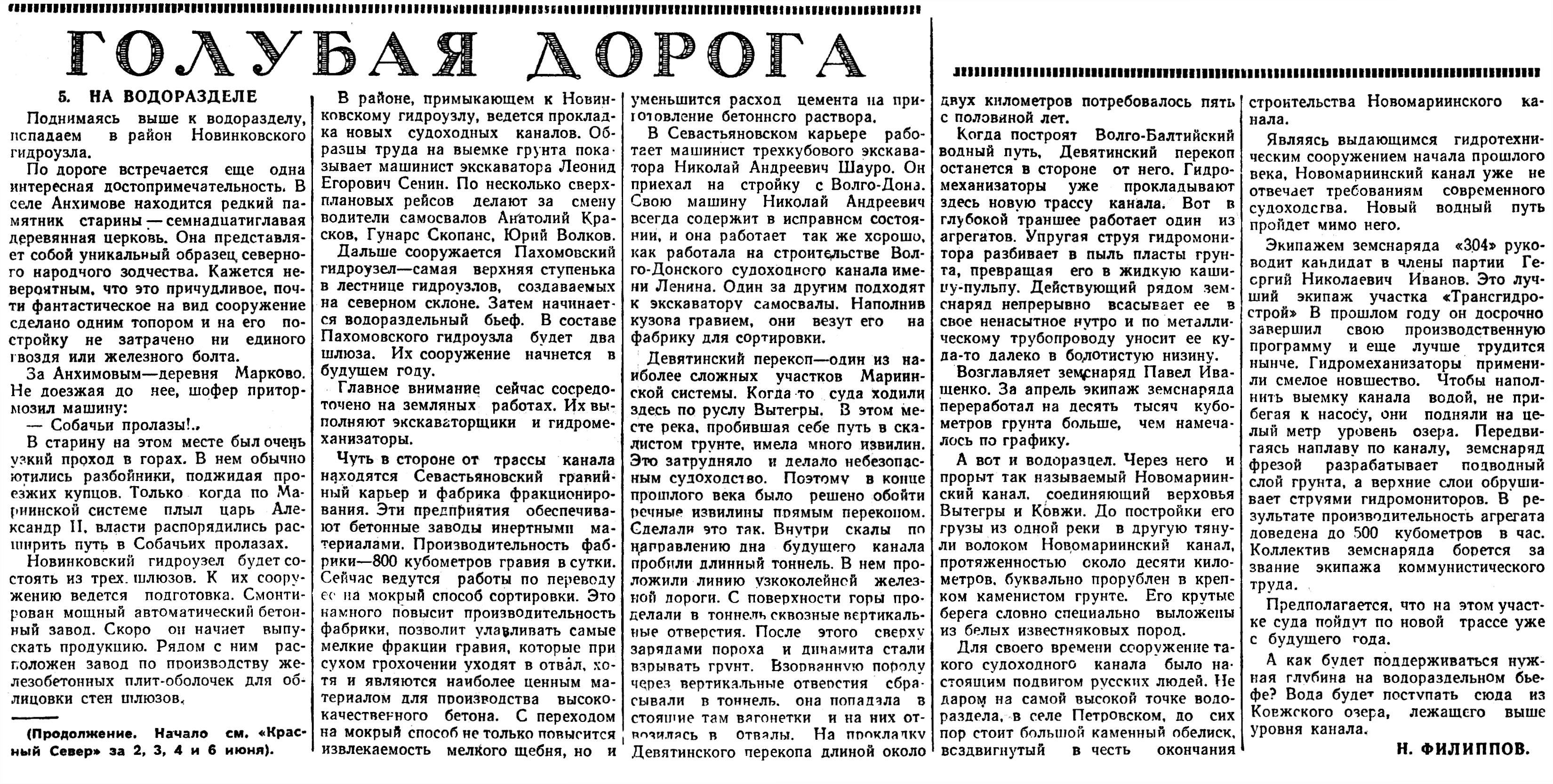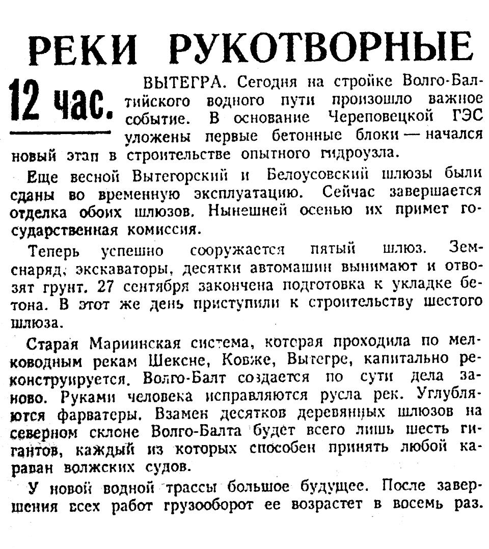 Вытегорский бетонный завод обеспечивает гидроузел раствором и облицовочными плитами — оболочками. Первенство в соревновании молодых бетонщиков держит комсомолка Валя Аносова. Как лучшую производственницу, ее избрали членом заводского комитета профсоюзе, депутатом Вытегорского районного Совета.