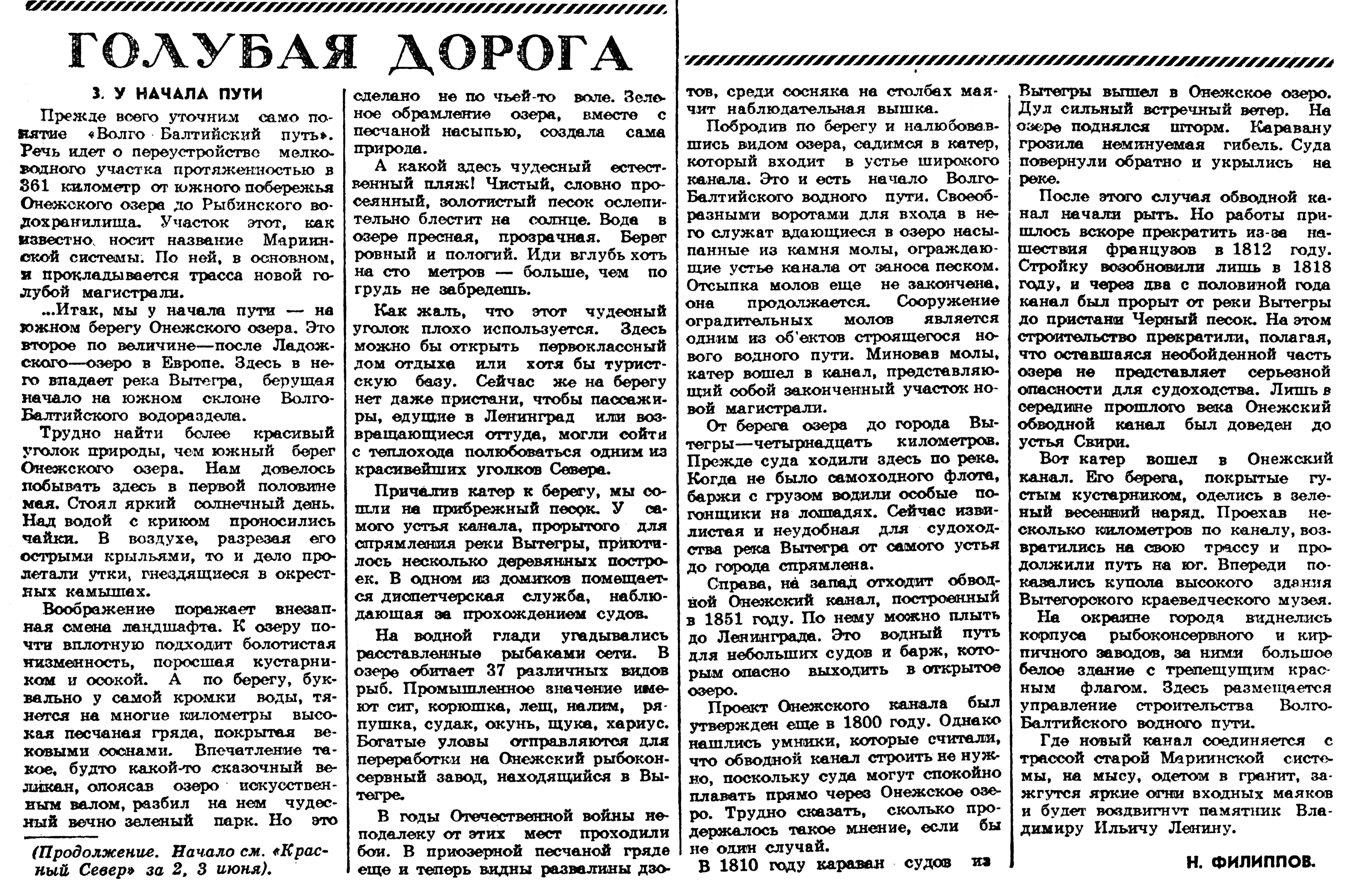 Особо следует сказать о значении Волго-Балтийского водного пути для Вологодской области. Пересекая ее с севера на юг, новая голубая магистраль пройдет по территории Вытегорского, Ковжинского, Шольского, Белозерского, Кирилловского, Пришекснпнского и Череповецкого районов. Эти районы, оказавшись на оживленной водной магистрали, получат мощный стимул для своего экономического развития.