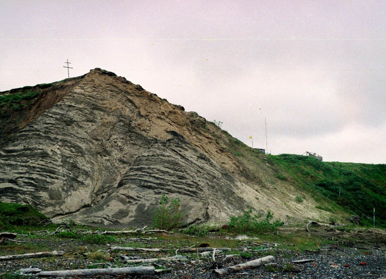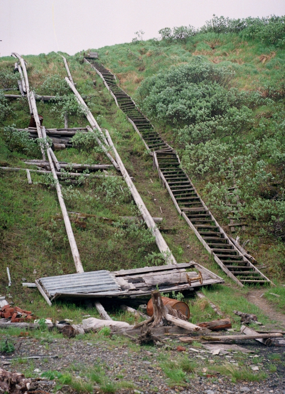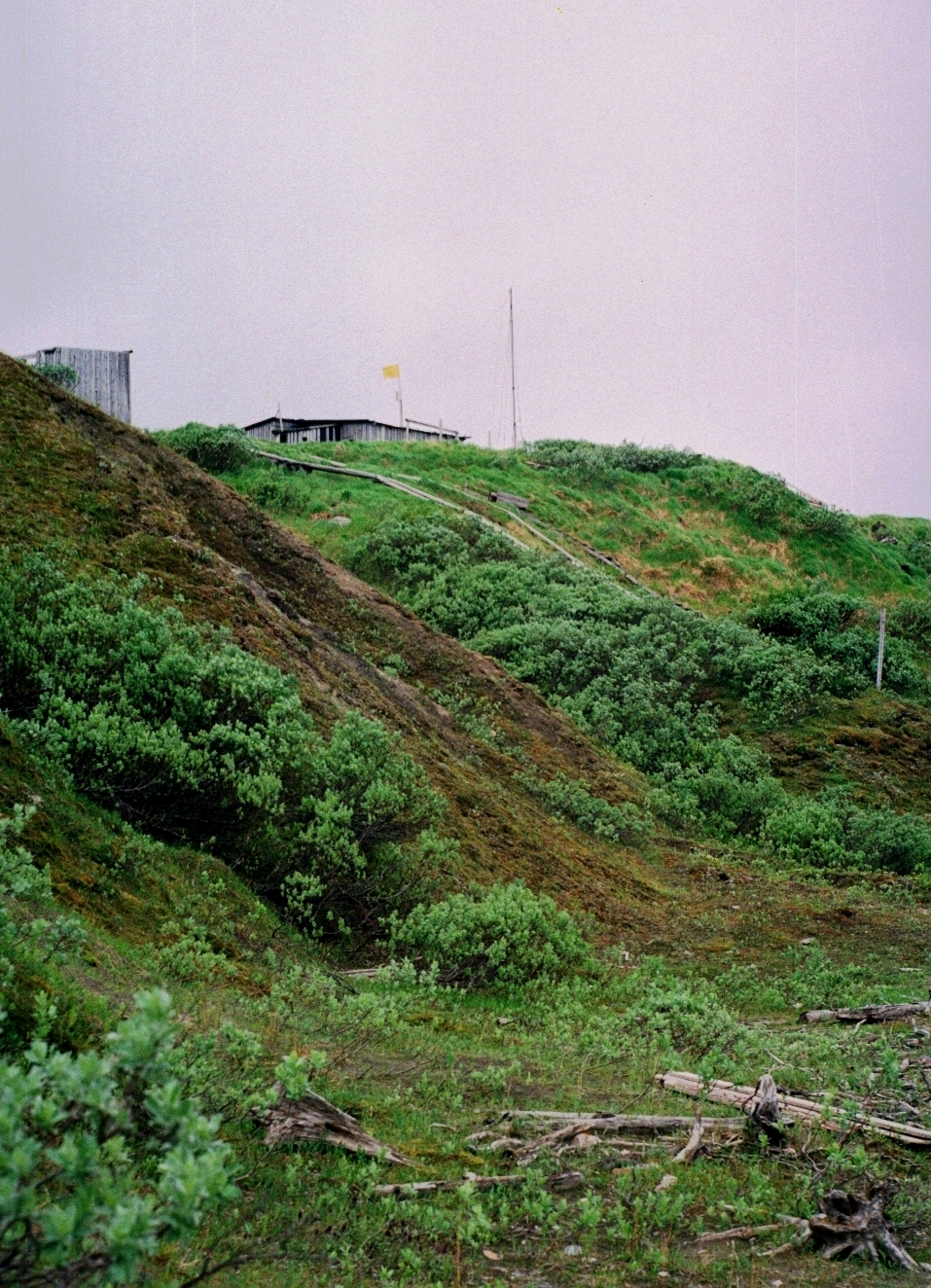 От берега к метеостанции, по склону тянулась деревянная, ступенчатая лестница. С левой стороны от лестницы, стояла заброшенная, бревенчатая подъемная дорога. Рельсами служили связанные друг с другом бревна, а вагонеткой, был деревянный шит, видимо ранее подымаемый лебедкой с помощью электродвигателя. Еще дальше, на верхушке сопки стоял памятный крест. С левой стороны от креста склон разрушился и обвалился, захватив с собой алюминиевую лодку. А у подножья этого склона, лежала еще одна, но уже деревянная лодка, с надписью на носу: «4 м № 91 78 г.»
