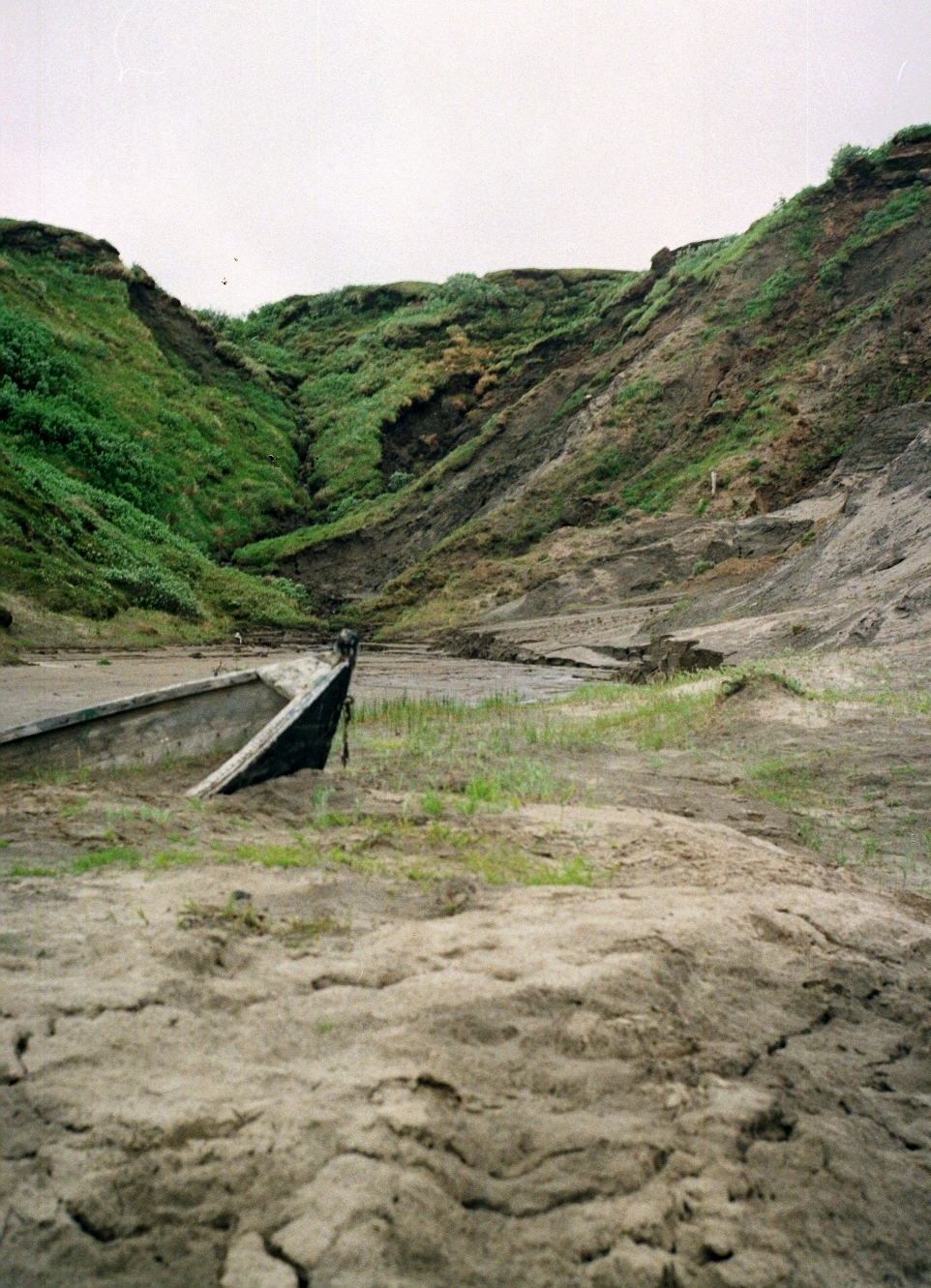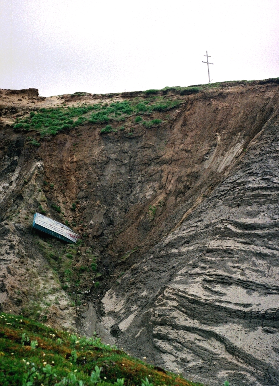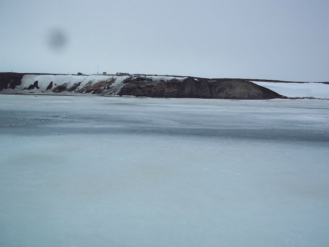 От берега к метеостанции, по склону тянулась деревянная, ступенчатая лестница. С левой стороны от лестницы, стояла заброшенная, бревенчатая подъемная дорога. Рельсами служили связанные друг с другом бревна, а вагонеткой, был деревянный шит, видимо ранее подымаемый лебедкой с помощью электродвигателя. Еще дальше, на верхушке сопки стоял памятный крест. С левой стороны от креста склон разрушился и обвалился, захватив с собой алюминиевую лодку. А у подножья этого склона, лежала еще одна, но уже деревянная лодка, с надписью на носу: «4 м № 91 78 г.»