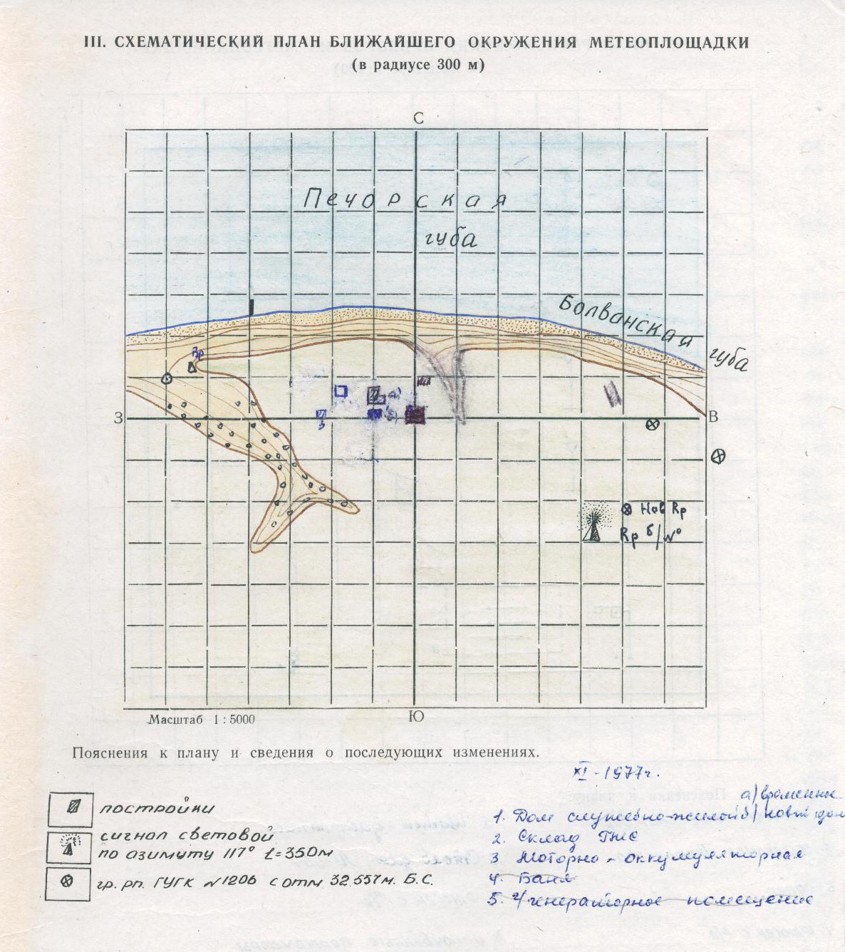Метеорологическая площадка станции помещалась на открытом месте, имеющем незначительный уклон к западу, в 50 м от берега моря. В 35 м к северо-северо-востоку стоял дом станции высотой 6-7 м. В 100 м к юго-западу находился овраг глубиной 8-12 м, шириной 15-30 м, по дну которого протекает ручей. Поверхность площадки неровная, покрыта тундровой растительностью. По склону оврага растет ива высотой 1-2 м. Почва на метеоплощадке песчаная.
