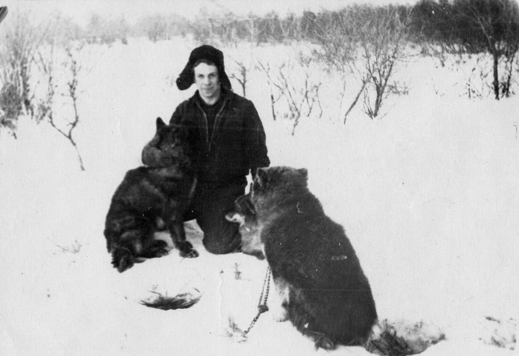 Ножницкий Владилен Владимирович и вожаки упряжки Ненен и Полярник. До 1970 г.