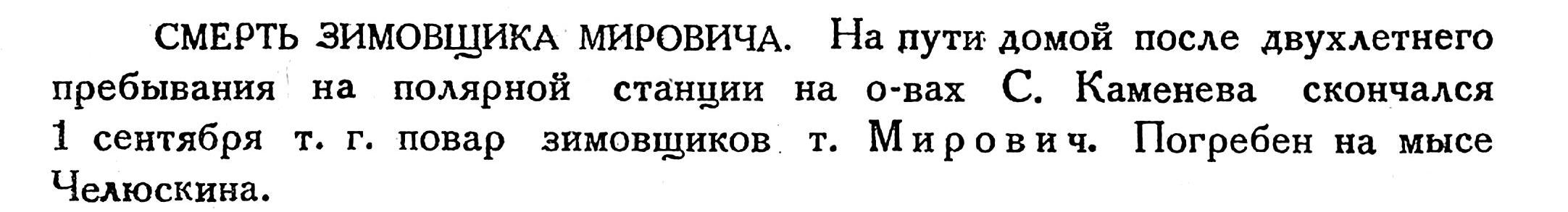 СМЕРТЬ ЗИМОВЩИКА МИРОВИЧА. На пути домой после двухлетнего пребывания на полярной станции на о-вах С. Каменева скончался 1 сентября т. г. повар зимовщиков т. Мирович. Погребен на мысе Челюскина.