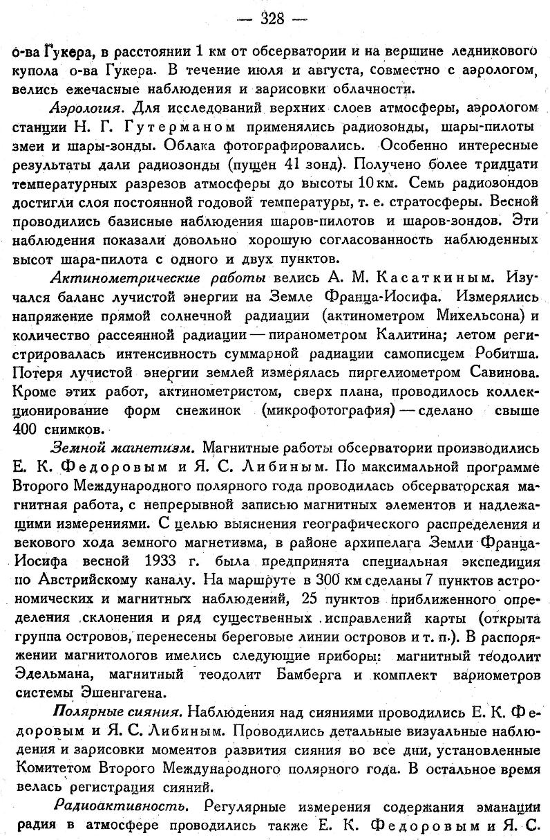 Земной магнетизм. Магнитные работы обсерватории производились Е. К. Федоровым и Я. С. Либиным. По максимальной программе Второго Международного полярного года проводилась обсерваторская магнитная работа, с непрерывной записью магнитных элементов и надлежащими измерениями. С целью выяснения географического распределения и векового хода земного магнетизма, в районе архипелага Земли Франца-Иосифа весной 1933 г. была предпринята специальная экспедиция по Австрийскому каналу. На маршруте в 300 км сделаны 7 пунктов астрономических и магнитных наблюдений, 25 пунктов приближенного определения склонения и ряд существенных исправлений карты (открыта группа островов, перенесены береговые линии островов и т. п.). В распоряжении магнитологов имелись следующие приборы: магнитный теодолит Эдельмана, магнитный теодолит Бамберга и комплект вариометров системы Эшенгагена.