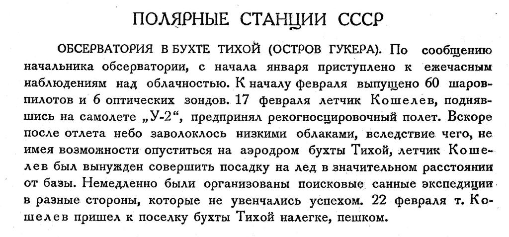 ОБСЕРВАТОРИЯ В БУХТЕ ТИХОЙ (ОСТРОВ ГУКЕРА). По сообщению начальника обсерватории, с начала января приступлено к ежечасным наблюдениям над облачностью. К началу февраля выпущено 60 шаров-пилотов и 6 оптических зондов. 17 февраля летчик Кошелев, поднявшись на самолете „У-2“, предпринял рекогносцировочный полет. Вскоре после отлета небо заволоклось низкими облаками, вследствие чего, не имея возможности опуститься на аэродром бухты Тихой, летчик Кошелев был вынужден совершить посадку на лед в значительном расстоянии от базы. Немедленно были организованы поисковые санные экспедиции в разные стороны, которые не увенчались успехом. 22 февраля т. Кошелев пришел к поселку бухты Тихой налегке, пешком.