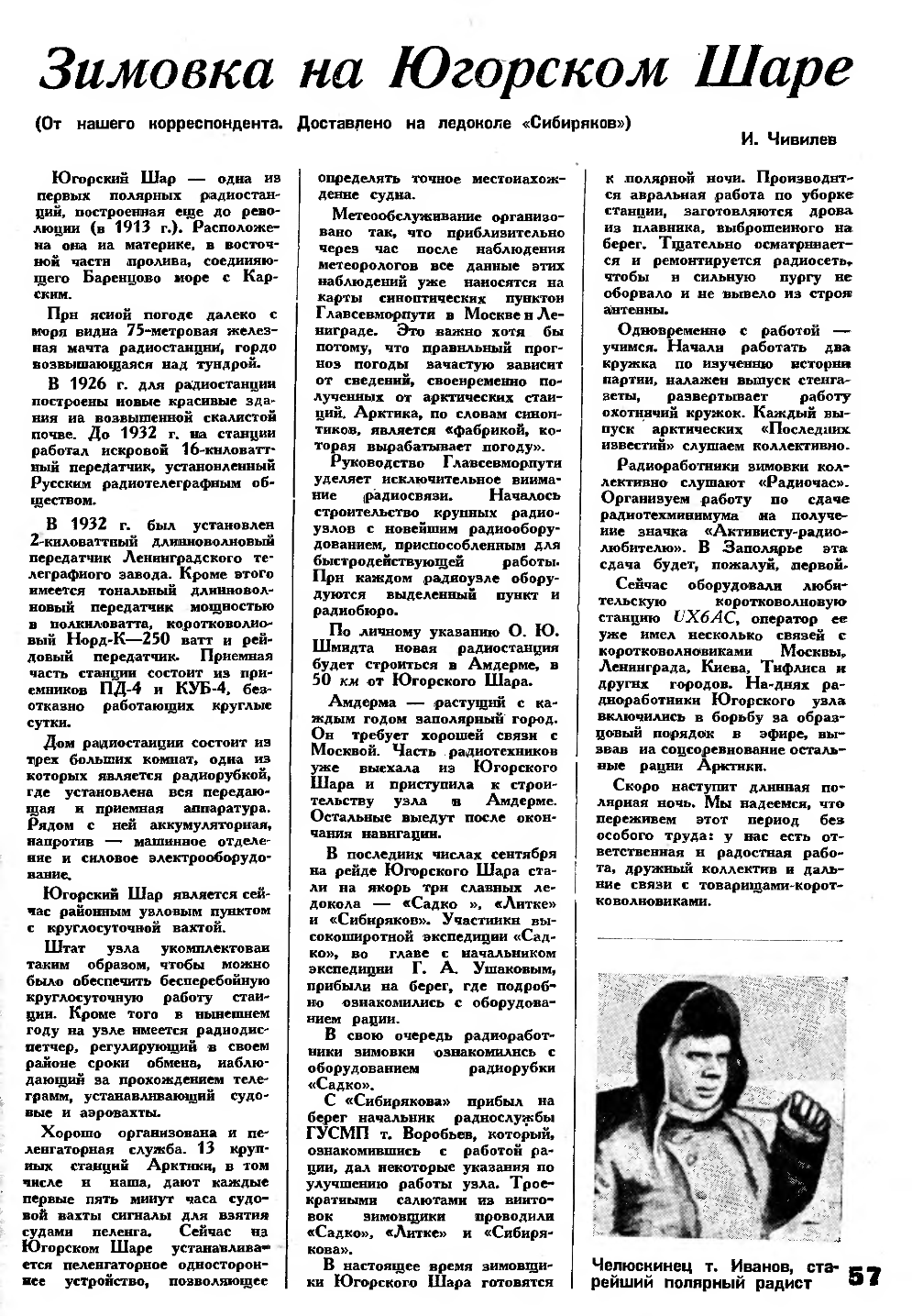 Сейчас оборудовали любительскую коротковолновую станцию 1X6АС, оператор ее уже имел несколько связей с коротковолновиками Москвы, Ленинграда, Киева. Тифлиса и других городов. Ha днях радиоработники Югорского узла включились в борьбу за образцовый порядок в эфире, вызвав ка соцсоревнование остальные рации Арктики.
