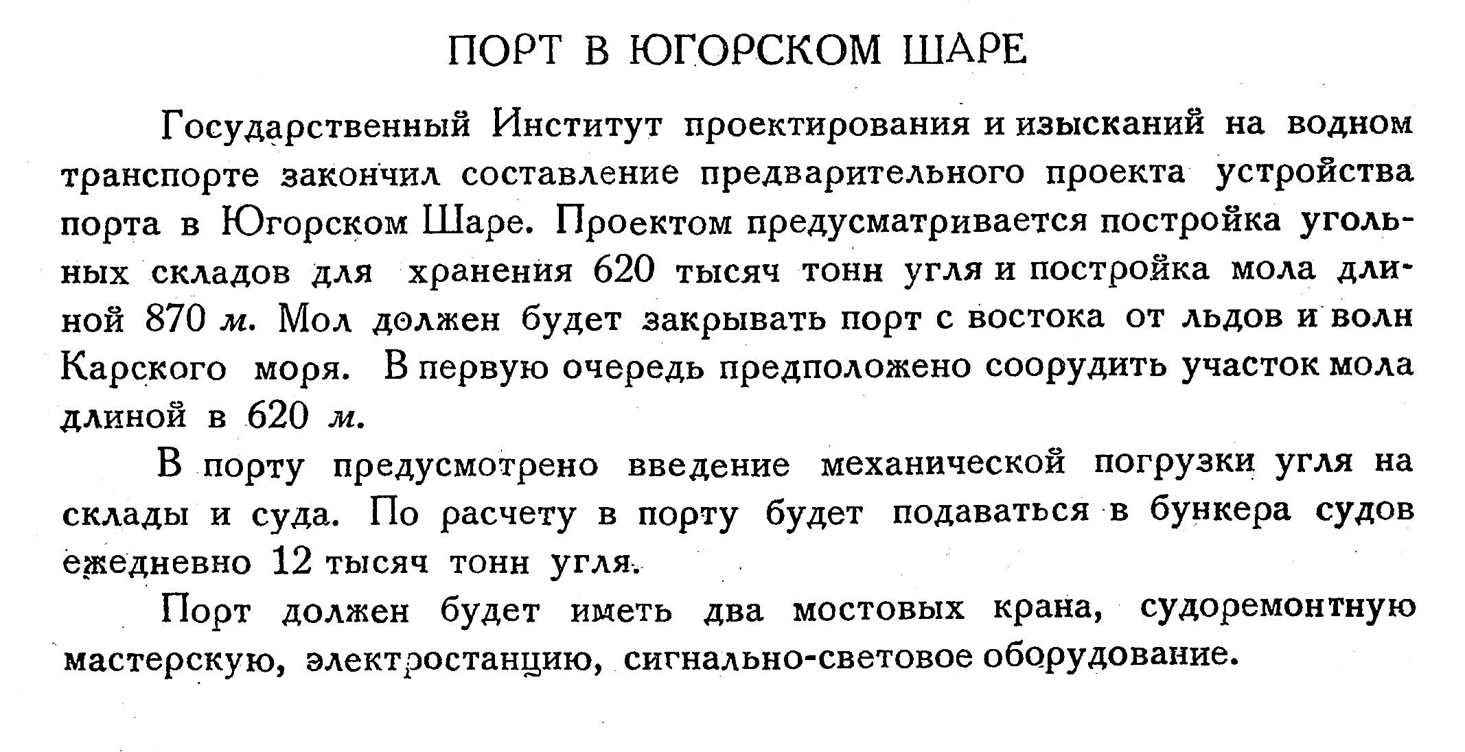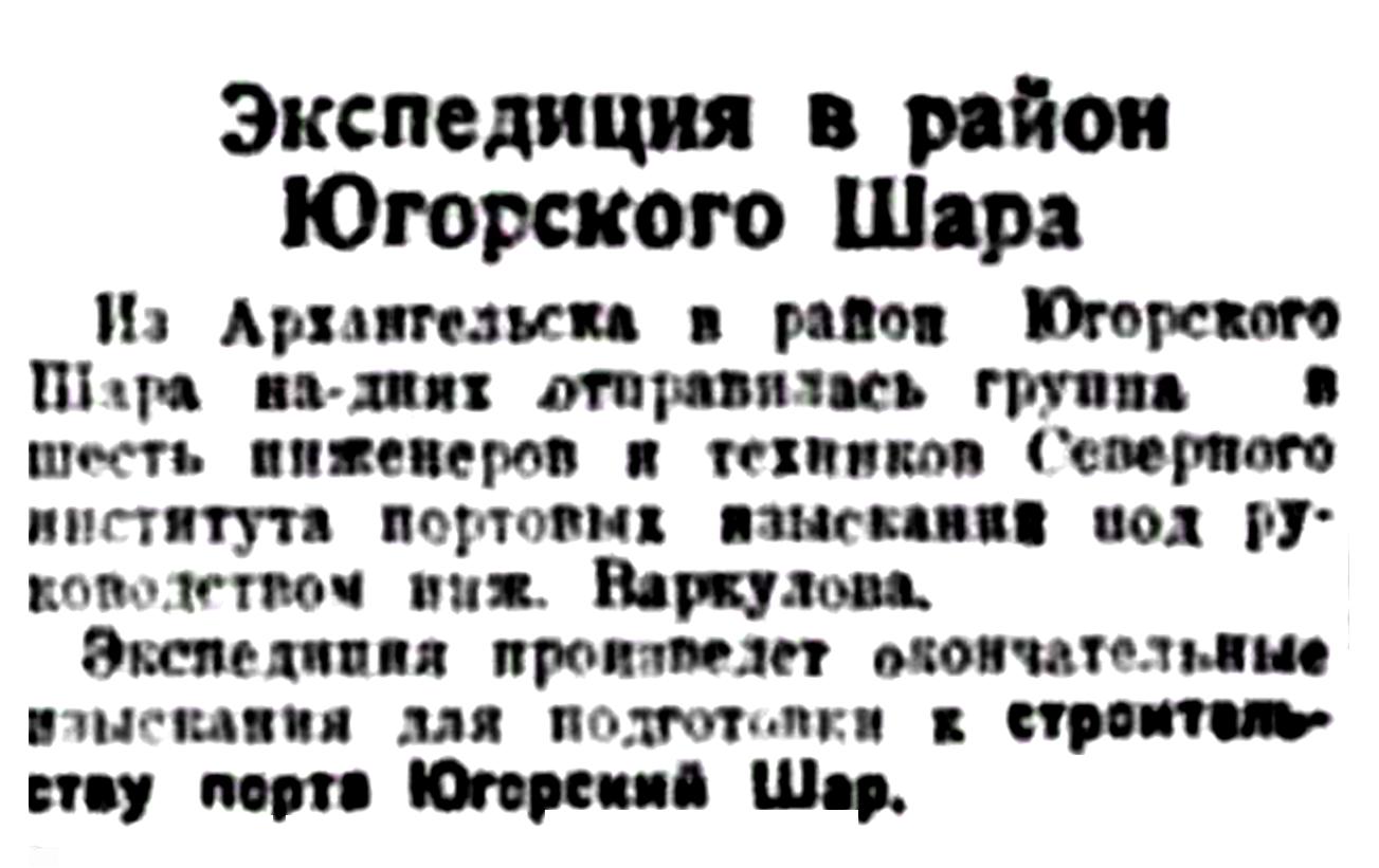На берегах пролива ЮГОРСКИЙ ШАР и в прилегающих к нему районах интенсивно работает несколько экспедиций, подготовляющих своими работами строительство порта ЮГОРСКИЙ ШАР и железной дороги, которая свяжет его с ВОРКУТОЙ.
