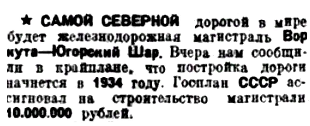★ САМОЙ СЕВЕРНОЙ дорогой в мире будет железнодорожная магистраль Воркута — Югорский Шар. Вчера нам сообщили в крайплане» что постройка дороги начнется в 1934 году. Госплан СССР ассигновал на строительство магистрали 10.000.000 рублей.