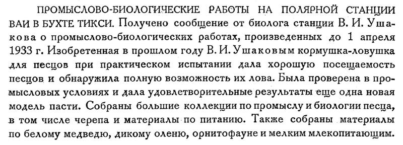 ПРОМЫСЛОВО-БИОЛОГИЧЕСКИЕ РАБОТЫ НА ПОЛЯРНОЙ СТАНЦИИ ВАИ В БУХТЕ ТИКСИ. Получено сообщение от биолога станции В. И. Ушакова о промыслово-биологических работах, произведенных до 1 апреля 1933 г. Изобретенная в прошлом году В. И. Ушаковым кормушка-ловушка для песцов при практическом испытании дала хорошую посещаемость песцов и обнаружила полную возможность их лова. Была проверена в промысловых условиях и дала удовлетворительные результаты еще одна новая модель пасти. Собраны большие коллекции по промыслу и биологии песца, в том числе черепа и материалы по питанию. Также собраны материалы по белому медведю, дикому оленю, орнитофауне и мелким млекопитающим.
