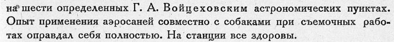БУХТА ТИКСИ. В первой половине мая на станцию вернулась партия, ездившая на аэросанях и собаках в губу Борхая. Произведена полуинструментальная съемка губы Борхая на протяжении 560 км, основывающаяся на шести определенных Г. А. Войцеховским астрономических пунктах. Опыт применения аэросаней совместно с собаками при съемочных работах оправдал себя полностью. На станции все здоровы.