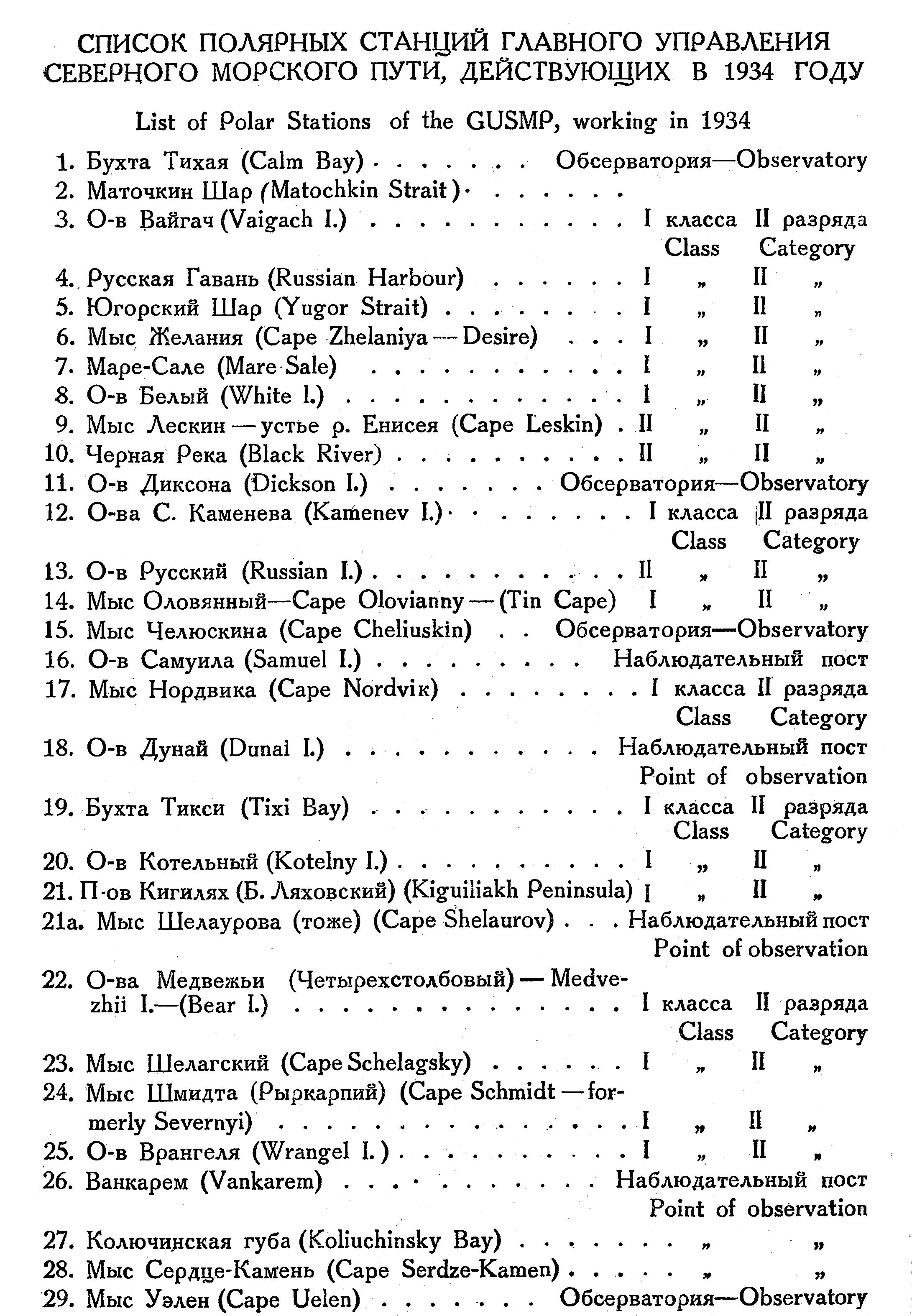 СПИСОК ПОЛЯРНЫХ СТАНЦИЙ ГЛАВНОГО УПРАВЛЕНИЯ СЕВЕРНОГО МОРСКОГО ПУТИ, ДЕЙСТВУЮЩИХ В 1934 ГОДУ