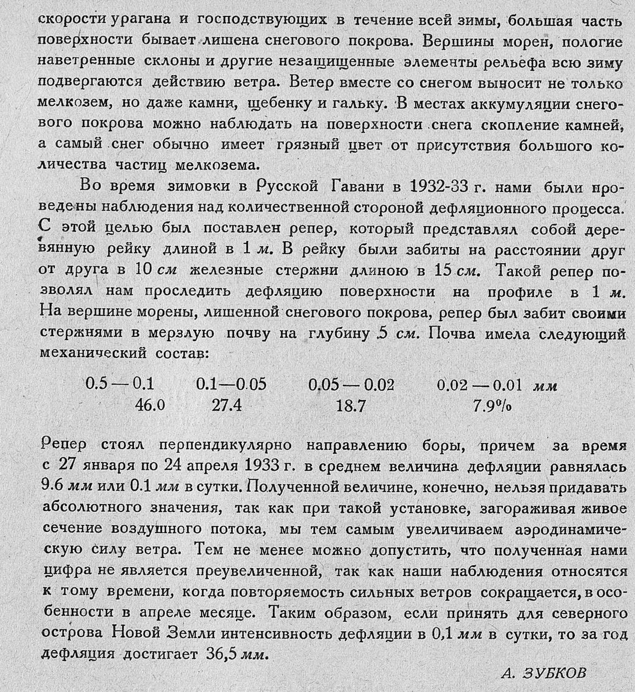 Во время зимовки в Русской Гавани в 1932-33 г. нами были проведены наблюдения над количественной стороной дефляционного процесса. С этой целью был поставлен репер, который представлял собой деревянную рейку длиной в 1 м. В рейку были забиты на расстоянии друг от друга в 10 см железные стержни длиною в 15 см. Такой репер позволял нам проследить дефляцию поверхности на профиле в 1 м. На вершине морены, лишенной снегового покрова, репер был забит своими стержнями в мерзлую почву на глубину 5 см. Почва имела следующий механический состав: