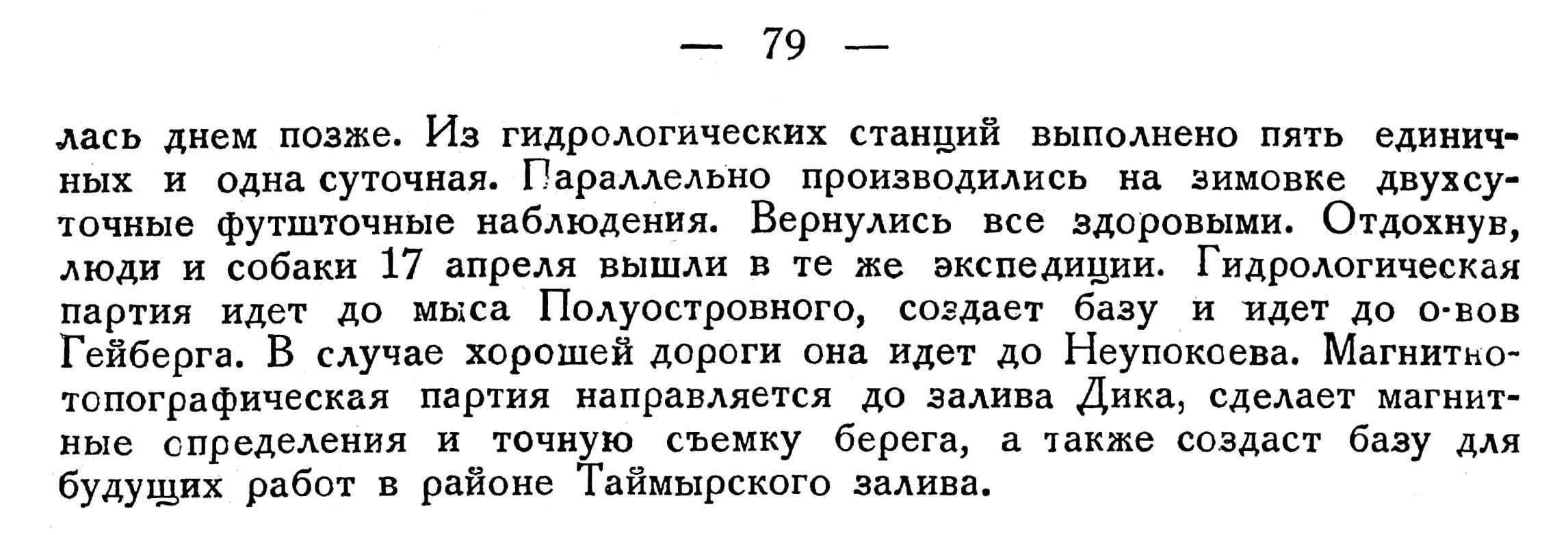 лась днем позже. Из гидрологических станций выполнено пять единичных и одна суточная. Параллельно производились на зимовке двухсуточные футшточные наблюдения. Вернулись все здоровыми. Отдохнув, люди и собаки 17 апреля вышли в те же экспедиции. Гидрологическая партия идет до мыса Полуостровного, создает базу и идет до о-вов Гейберга. В случае хорошей дороги она идет до Неупокоева. Магнитнотопографическая партия направляется до залива Дика, сделает магнитные определения и точную съемку берега, а также создаст базу для будущих работ в районе Таймырского залива.