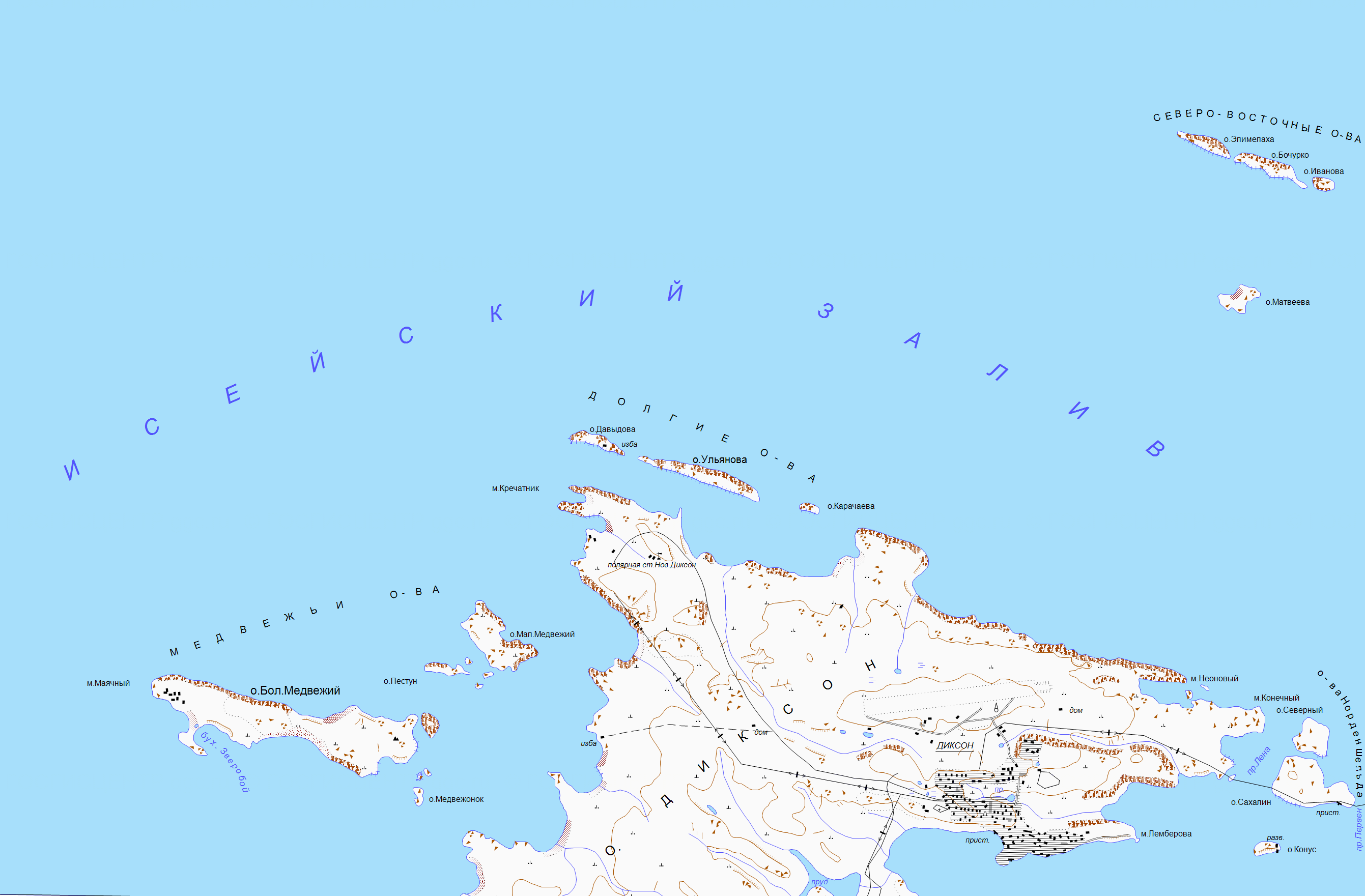 Наконец 17 августа, около 5 час. дня, на горизонте показался остров Диксон. Очень скоро мы увидели громадную мачту беспроволочного телеграфа,а в 7 час.вечера начали входить в пролив между островом и берегом. Около 8 час. стали на якорь. Здесь находились пароход „Туруханск" и три лихтера. Еще мы не успели стать на якорь, как подошел мотор, в котором были доктор Кушаков, лейтенант Транзе, еще кто-то и матрос. Сначала они вышли на „Таймыр", а потом приехали к нам.