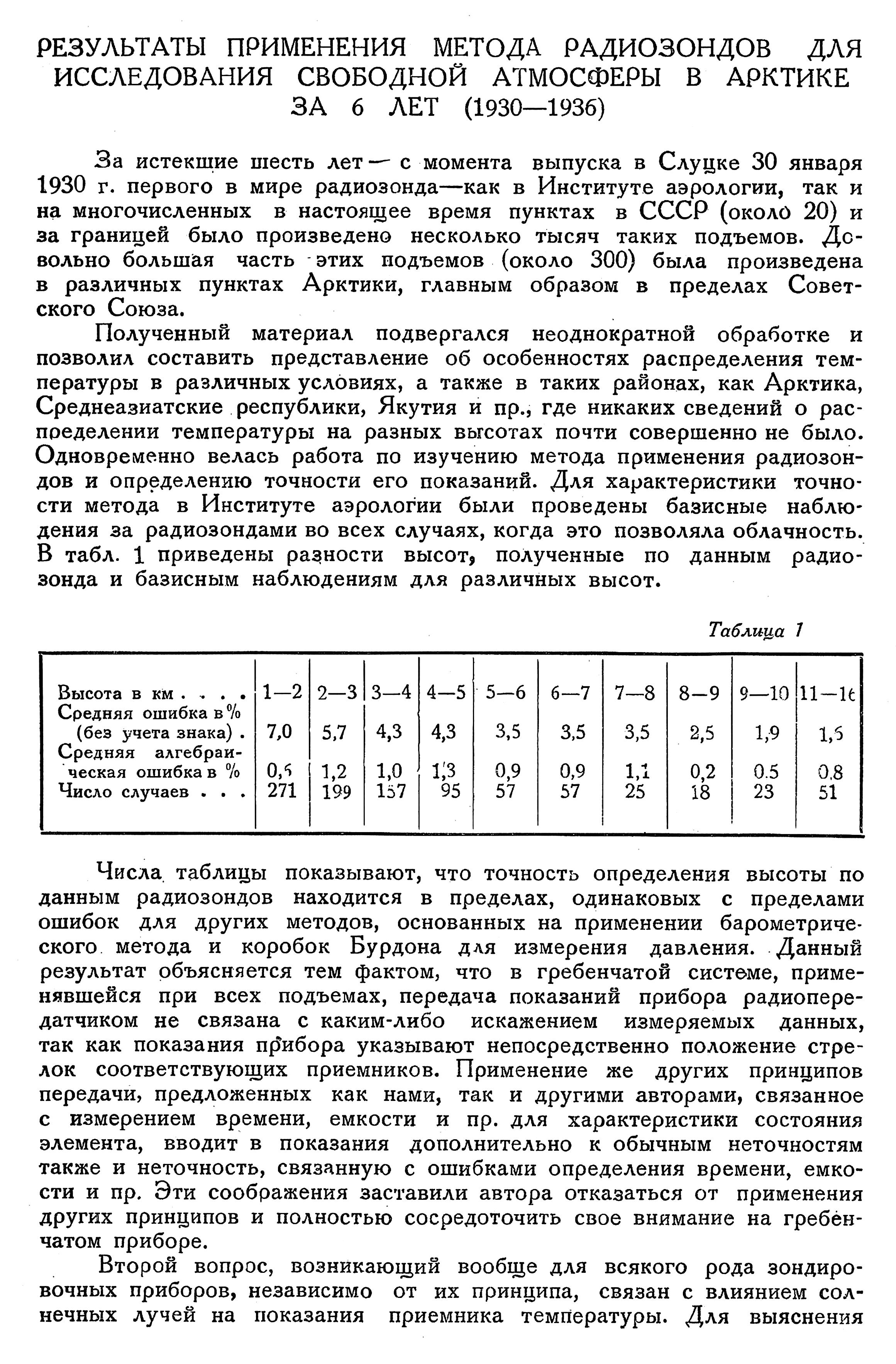Полученный материал подвергался неоднократной обработке и позволил составить представление об особенностях распределения температуры в различных условиях,а также в таких районах,как Арктика,Среднеазиатские республики,Якутия и пр.,где никаких сведений о распределении температуры на разных высотах почти совершенно не было. Одновременно велась работа по изучению метода применения радиозондов и определению точности его показаний. Для характеристики точности метода в Институте аэрологии были проведены базисные наблюдения за радиозондами во всех случаях,когда это позволяла облачность. В табл. 1 приведены разности высот,полученные по данным радиозонда и базисным наблюдениям для различных высот.