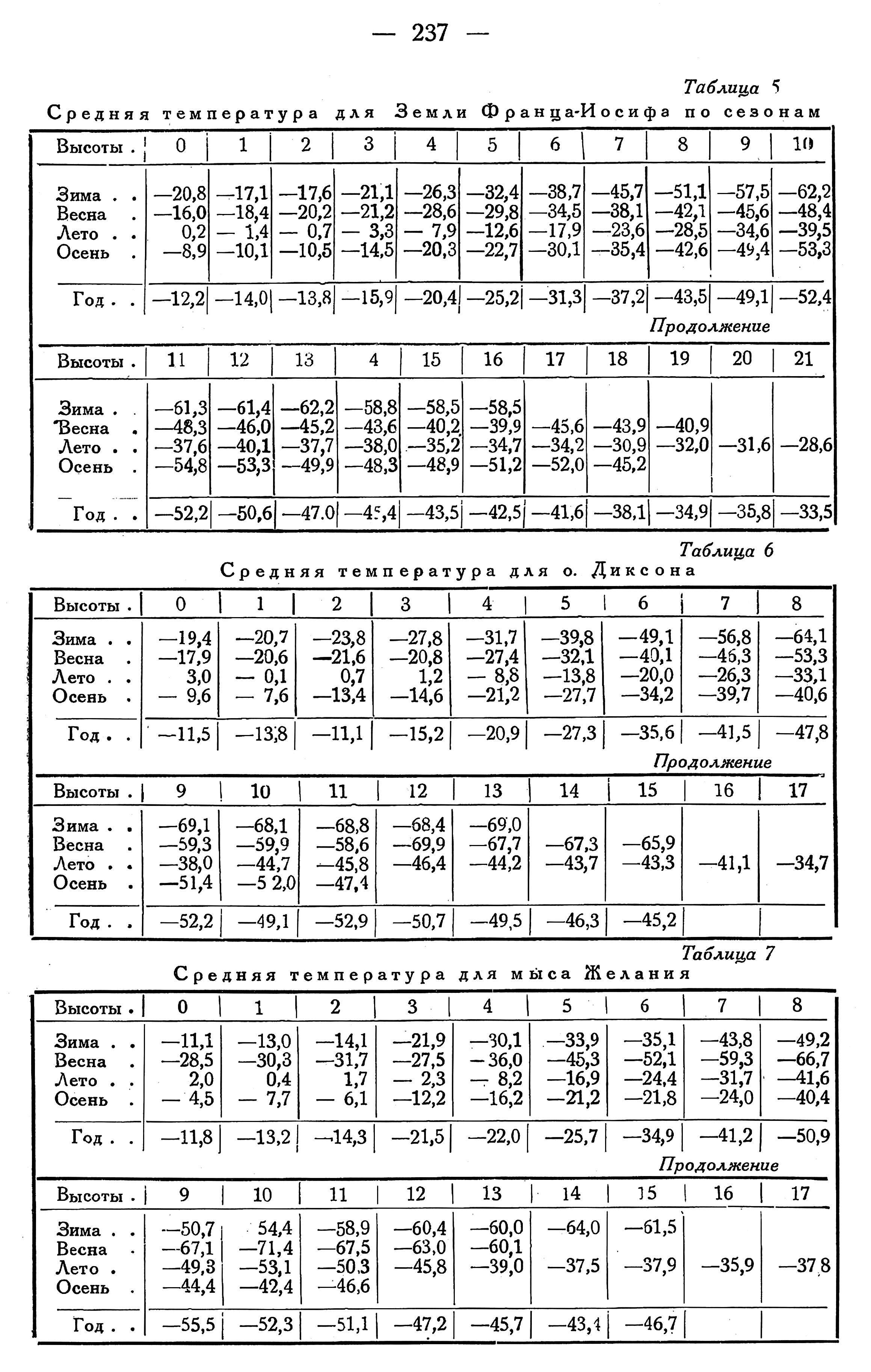 атмосферы во время полярной ночи были произведены автором еще в 1931 г. в с. Полярном (Мурман),где было произведено 9 зондировок,из которых одна дала высоту стратосферы. После этих подъемов мы имеем много наблюдений на Земле Франца—Иосифа,о. Диксона,мысе Желания и др. Для характеристики температурного режима полярной атмосферы представляет наибольший интерес сравнение температур над полярными и более южными станциями в различное время года. В табл. 4 приведены средние годовые разности,полученные по зондировкам в одни и те же дни на различных станциях полярного бассейна и в Институте аэрологии в Слуцке.