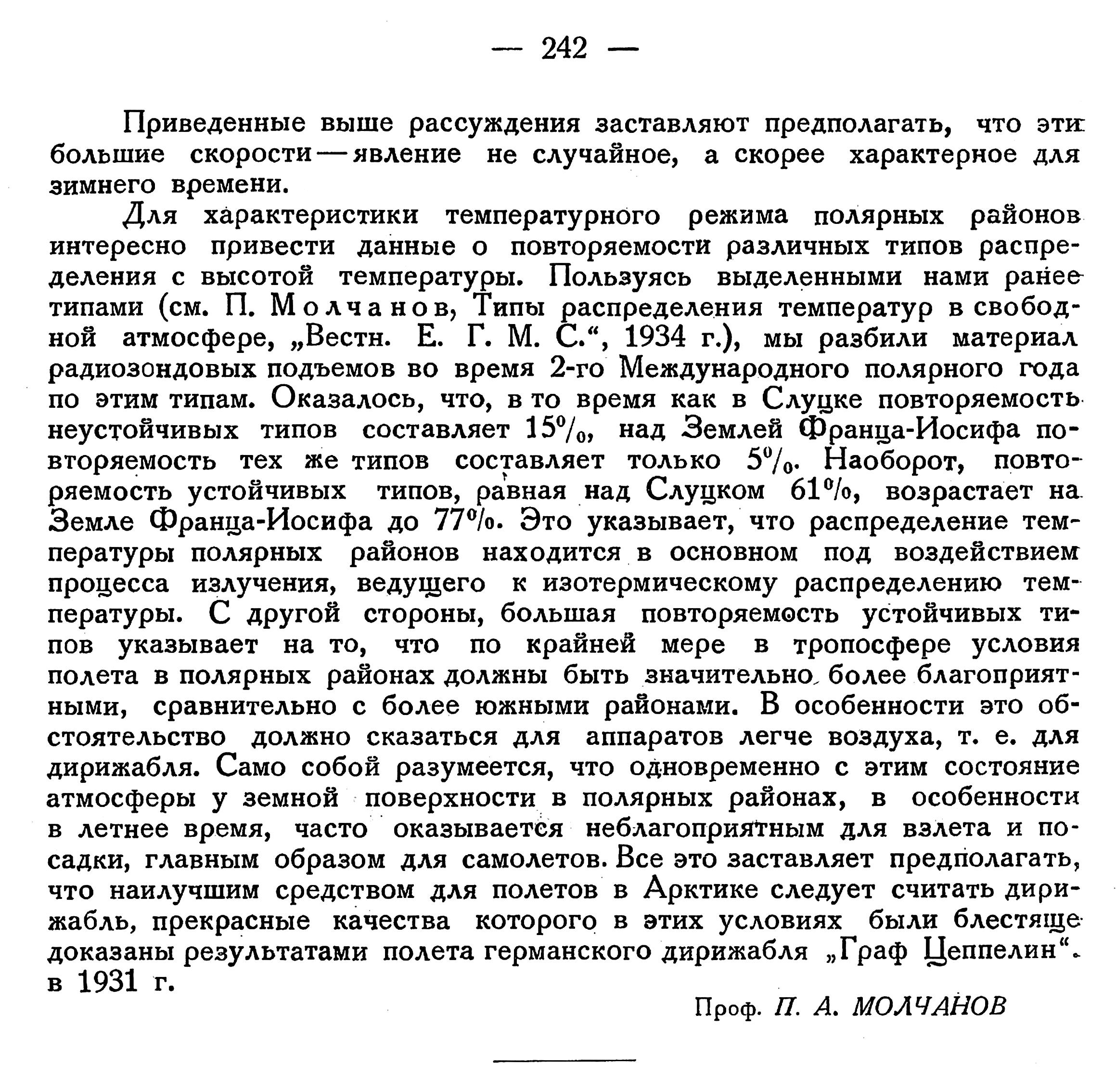 Для характеристики температурного режима полярных районов интересно привести данные о повторяемости различных типов распределения с высотой температуры. Пользуясь выделенными нами ранее типами (см. П. Молчанов,Типы распределения температур в свободной атмосфере,„Вестн. Е. Г. М. С. ",1934 г. ),мы разбили материал радиозондовых подъемов во время 2—го Международного полярного года по этим типам. Оказалось,что,в то время как в Слуцке повторяемость неустойчивых типов составляет 15%,над Землей Франца—Иосифа повторяемость тех же типов составляет только 5%. Наоборот,повторяемость устойчивых типов,равная над Слуцком 61%,возрастает на Земле Франца—Иосифа до 77%. Это указывает,что распределение температуры полярных районов находится в основном под воздействием процесса излучения,ведущего к изотермическому распределению температуры. С другой стороны,большая повторяемость устойчивых типов указывает на то,что по крайней мере в тропосфере условия полета в полярных районах должны быть значительно более благоприятными,сравнительно с более южными районами. В особенности это обстоятельство должно сказаться для аппаратов легче воздуха,т. е. для дирижабля. Само собой разумеется,что одновременно с этим состояние атмосферы у земной поверхности в полярных районах,в особенности в летнее время,часто оказывается неблагоприятным для взлета и посадки,главным образом для самолетов. Все это заставляет предполагать,что наилучшим средством для полетов в Арктике следует считать дирижабль,прекрасные качества которого в этих условиях были блестяще доказаны результатами полета германского дирижабля „Граф Цеппелин",в 1931 г.