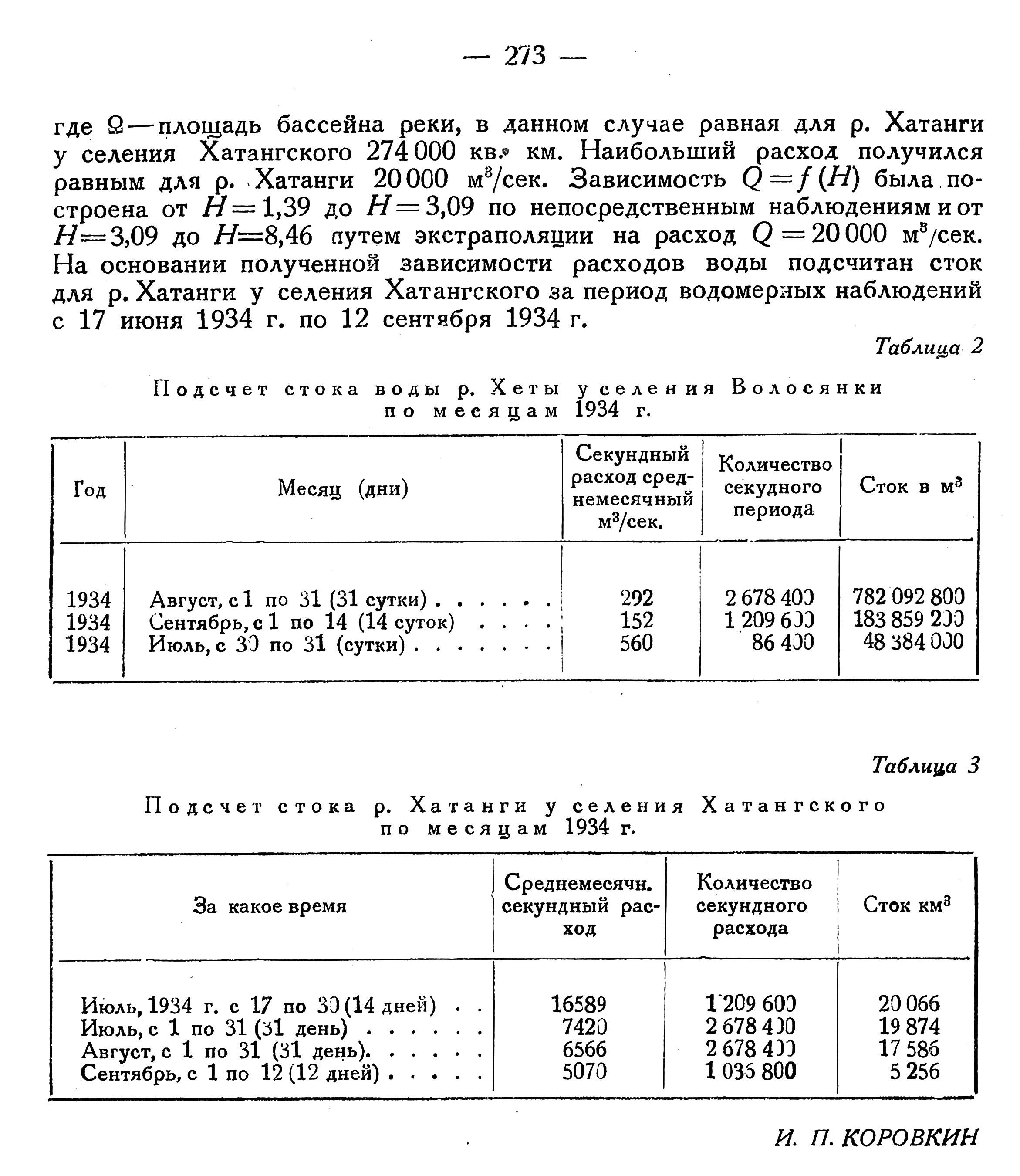 где Ω — площадь бассейна реки, в данном случае равная для р. Хатанги у селения Хатангского 274000 кв. км. Наибольший расход получился равным для р. Хатанги 20 000 м3/сек. Зависимость Q=f (H) была построена от Н = 1,39 до Н = 3,09 по непосредственным наблюдениям и от H = 3,09 до H = 8,46 путем экстраполяции на расход Q=20000 м3/сек. На основании полученной зависимости расходов воды подсчитан сток для р. Хатанги у селения Хатангского за период водомерных наблюдений с 17 июня 1934 г. по 12 сентября 1934 г.