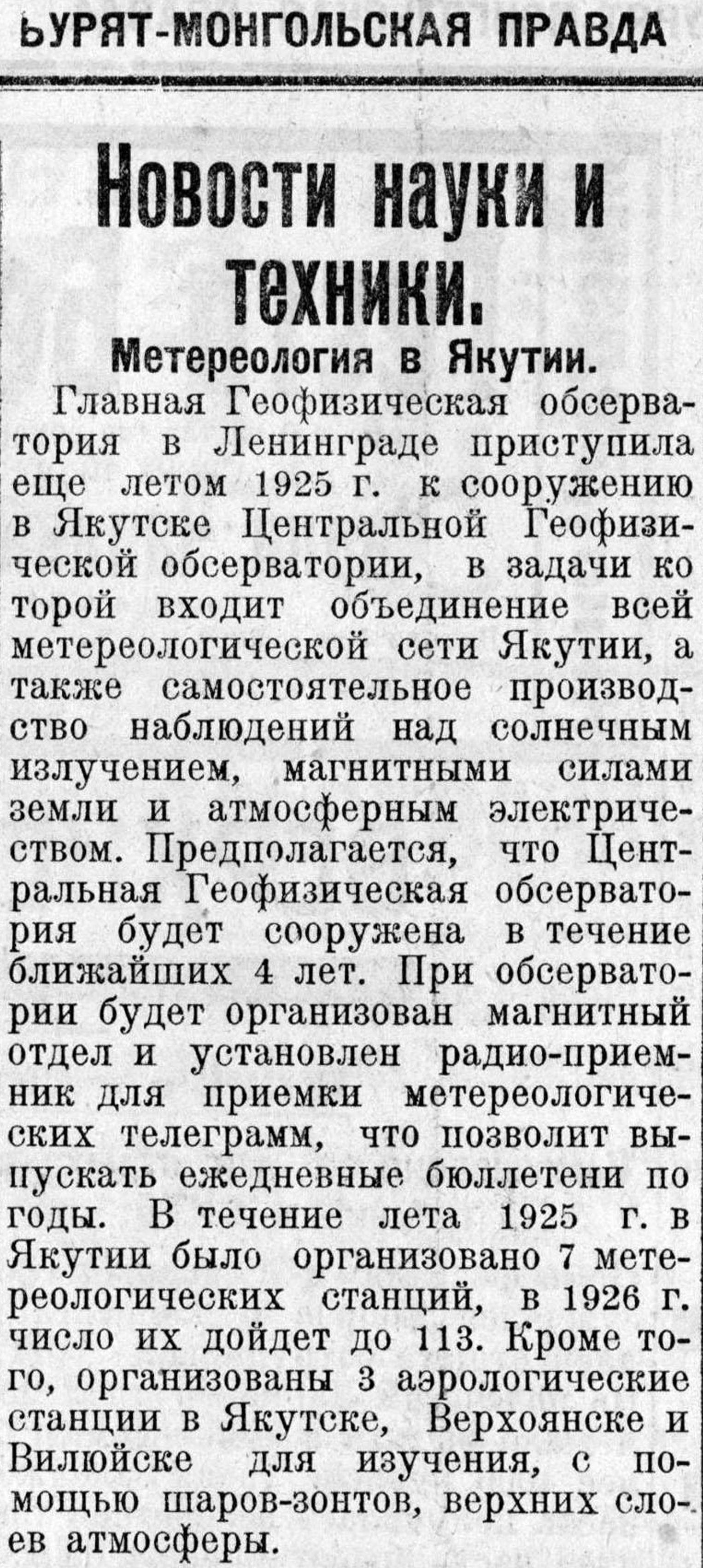Главная Геофизическая обсерватория в Ленинграде приступила еще летом 1925 г. к сооружению в Якутске Центральной Геофизической обсерватории, в задачи ко торой входит объединение всей метеорологической сети Якутии, а также самостоятельное производство наблюдений над солнечным излучением, магнитными силами земли и атмосферным электричеством. Предполагается, что Центральная Геофизическая обсерватория будет сооружена в течение ближайших 4 лет. При обсерватории будет организован магнитный отдел и установлен радиоприемник для приемки метеорологических телеграмм, что позволит выпускать ежедневные бюллетени по годы. В течение лета 1925 г. в Якутии было организовано 7 метеорологических станций, в 1926 г. число их дойдет до 113. Кроме того, организованы 3 аэрологические станции в Якутске, Верхоянске и Вилюйске для изучения, с помощью шаров-зонтов, верхних слоев атмосферы.