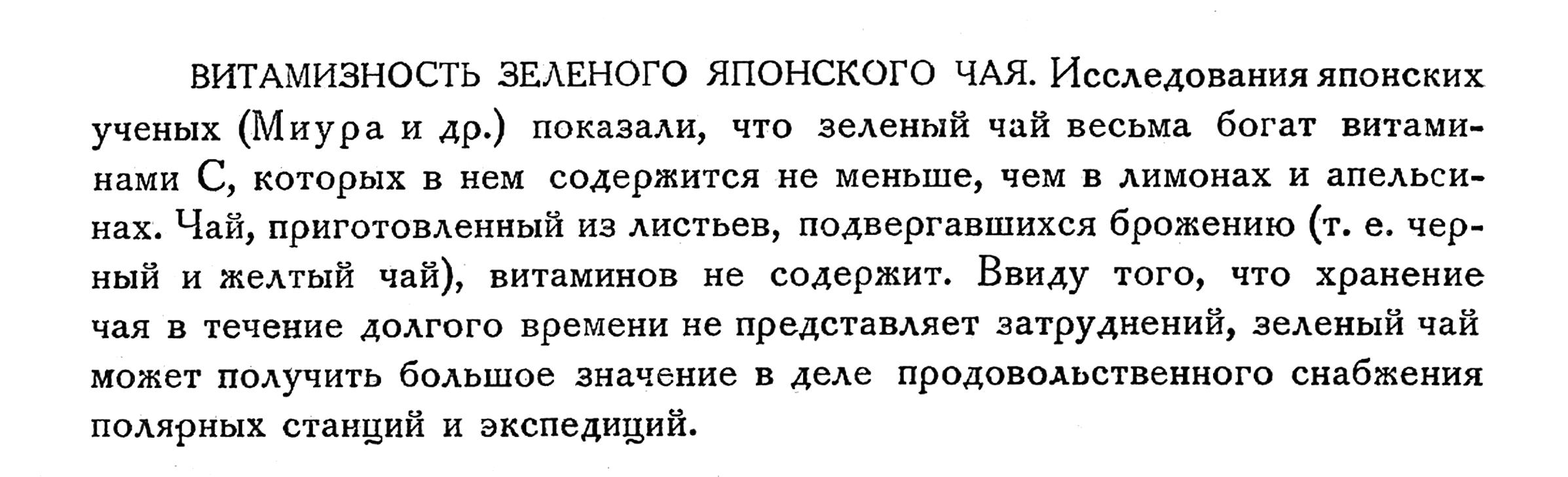 ВИТАМИНОЗНОСТЬ ЗЕЛЕНОГО ЯПОНСКОГО ЧАЯ. Исследования японских ученых (Миура и др. ) показали, что зеленый чай весьма богат витами­нами С, которых в нем содержится не меньше, чем в лимонах и апельси­нах. Чай, приготовленный из листьев, подвергавшихся брожению (т. е. чер­ный и желтый чай), витаминов не содержит. Ввиду того, что хранение чая в течение долгого времени не представляет затруднений, зеленый чай может получить большое значение в деле продовольственного снабжения полярных станций и экспедиций.