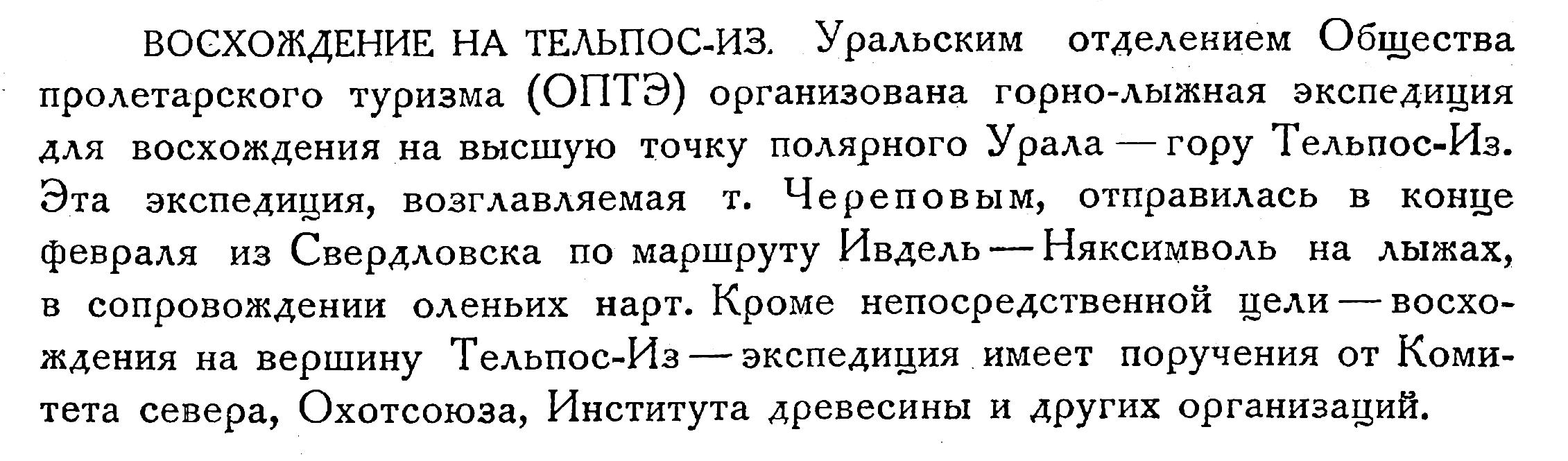 ВОСХОЖДЕНИЕ НА ТЕЛЬПОС-ИЗ. Уральским отделением Общества пролетарского туризма (ОПТЭ) организована горно-лыжная экспедиция для восхождения на высшую точку полярного Урала — гору Тельпос-Из. Эта экспедиция, возглавляемая т. Череповым, отправилась в конце февраля из Свердловска по маршруту Ивдель — Няксимволь на лыжах, в сопровождении оленьих нарт. Кроме непосредственной цели — восхождения на вершину Тельпос-Из — экспедиция имеет поручения от Комитета севера, Охотсоюза, Института древесины и других организаций.