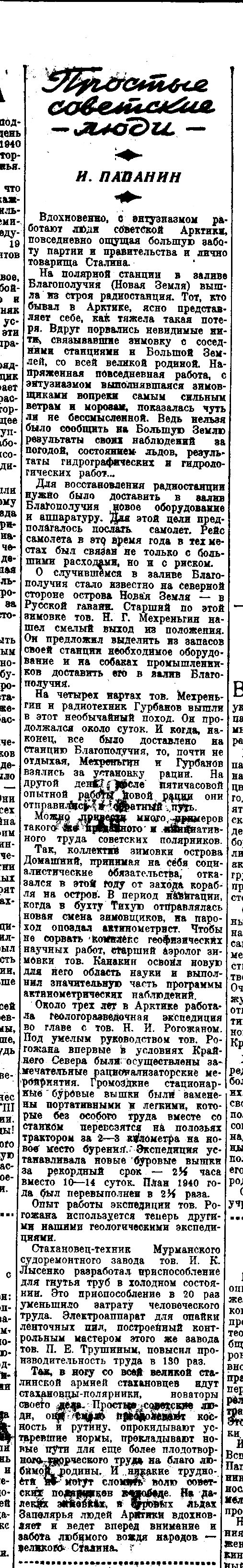 Папанин И.Простые советские люди//Вечерняя Москва 15 февраля 1941