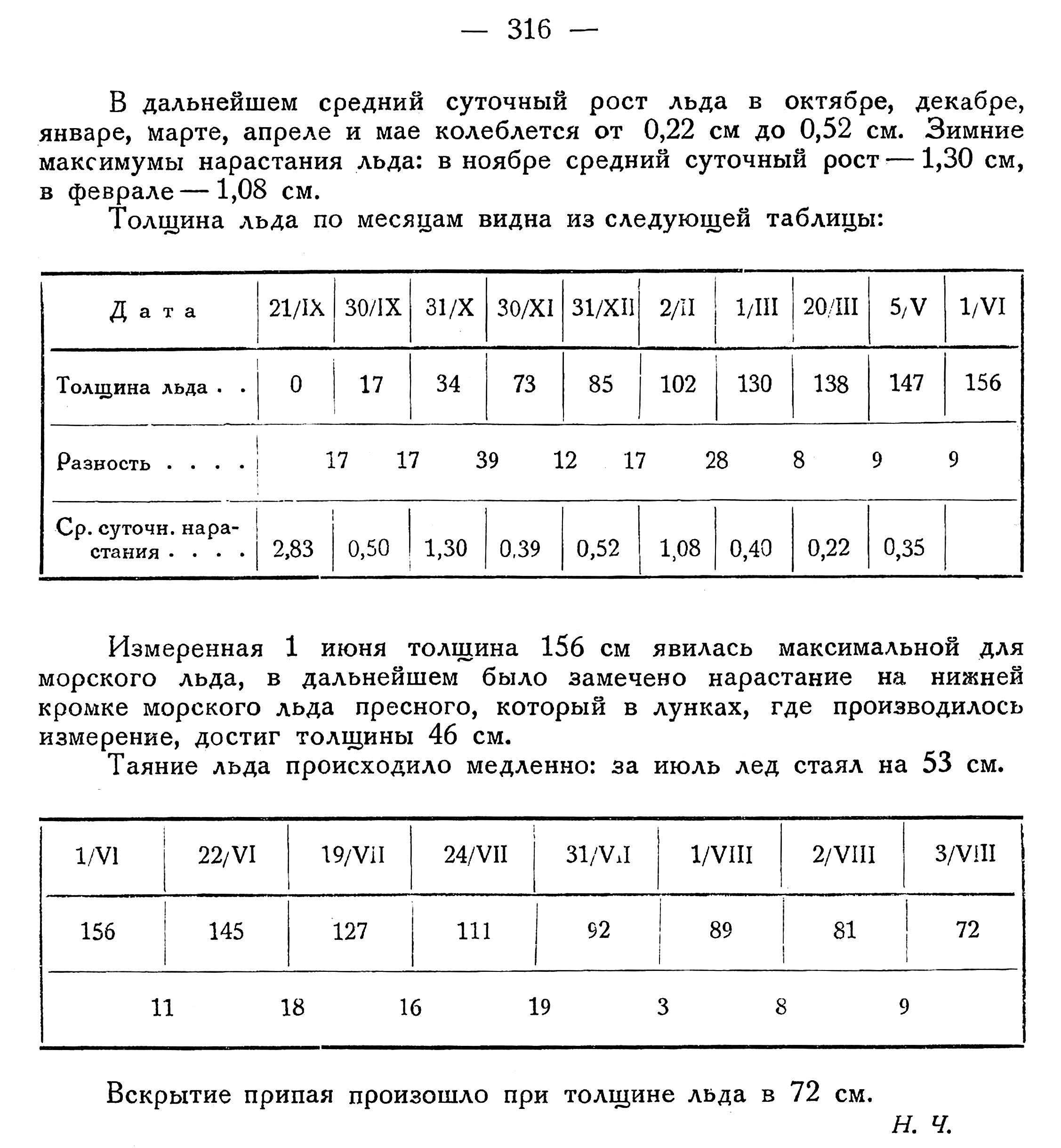 В зимовку 1934/35 гг. на о-ве Уединения наблюдения за ростом льда велись в 100 м от западного берега острова в ровном припае, где лед образовался в сентябре 1934 г. Первое измерение льда 25 сентября дало 2 см, 30 сентября толщина льда равнялась 17 см, т. е. средний суточный рост для конца сентября выражается в 2,83 см — это максимальная величина, характерная для начальной стадии ледообразования.
