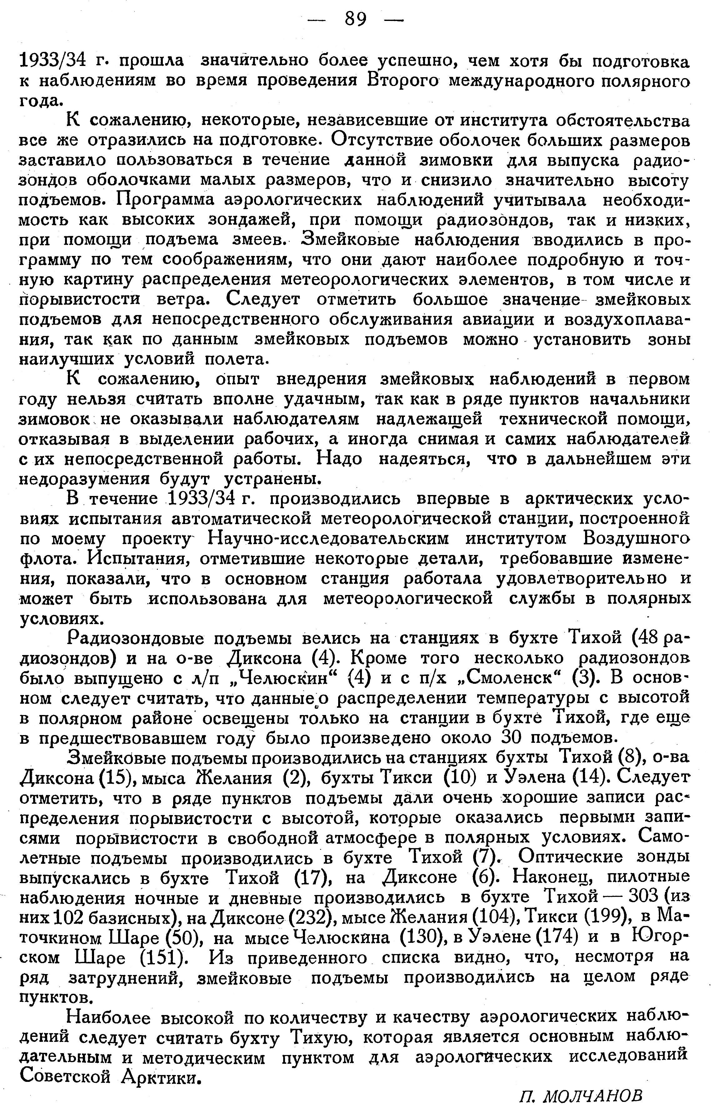 Благодаря энергичным мероприятиям Всесоюзного Арктического института и тому вниманию, которое оказывало аэроработам Полярное управление Главсевморпути, подготовка к аэрологическим наблюдениям 1933/34 г. прошла значительно более успешно, чем хотя бы подготовка к наблюдениям во время проведения Второго международного полярного года.