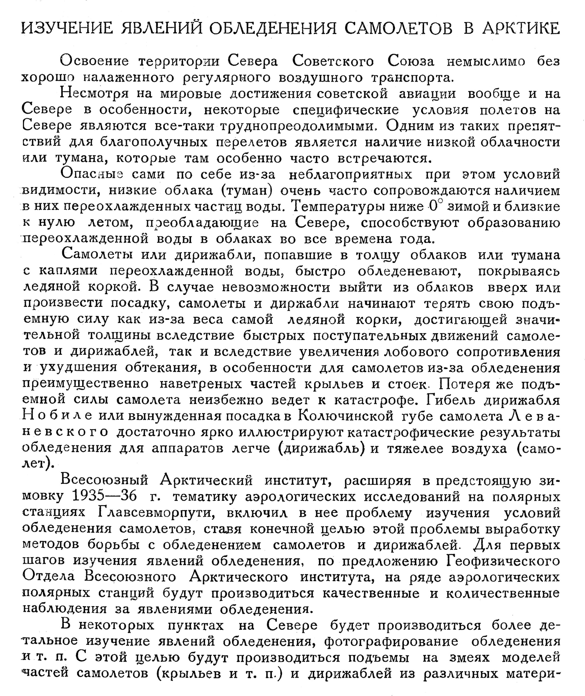 Всесоюзный Арктический институт, расширяя в предстоящую зимовку 1935—36 г. тематику аэрологических исследований на полярных станциях Главсевморпути, включил в нее проблему изучения условий обледенения самолетов, ставя конечной целью этой проблемы выработку методов борьбы с обледенением самолетов и дирижаблей. Для первых шагов изучения явлений обледенения, по предложению Геофизического Отдела Всесоюзного Арктического института, на ряде аэрологических полярных станций будут производиться качественные и количественные наблюдения за явлениями обледенения.
