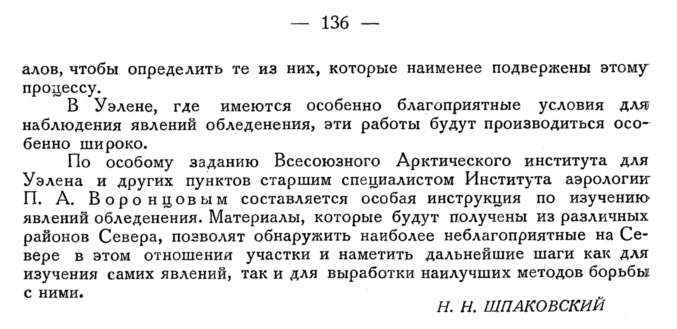 По особому заданию Всесоюзного Арктического института для Уэлена и других пунктов старшим специалистом Института аэрологии П. А. Воронцовым составляется особая инструкция по изучению явлений обледенения. Материалы, которые будут получены из различных районов Севера, позволят обнаружить наиболее неблагоприятные на Севере в этом отношения участки и наметить дальнейшие шаги как для изучения самих явлений, так и для выработки наилучших методов борьбы с ними.