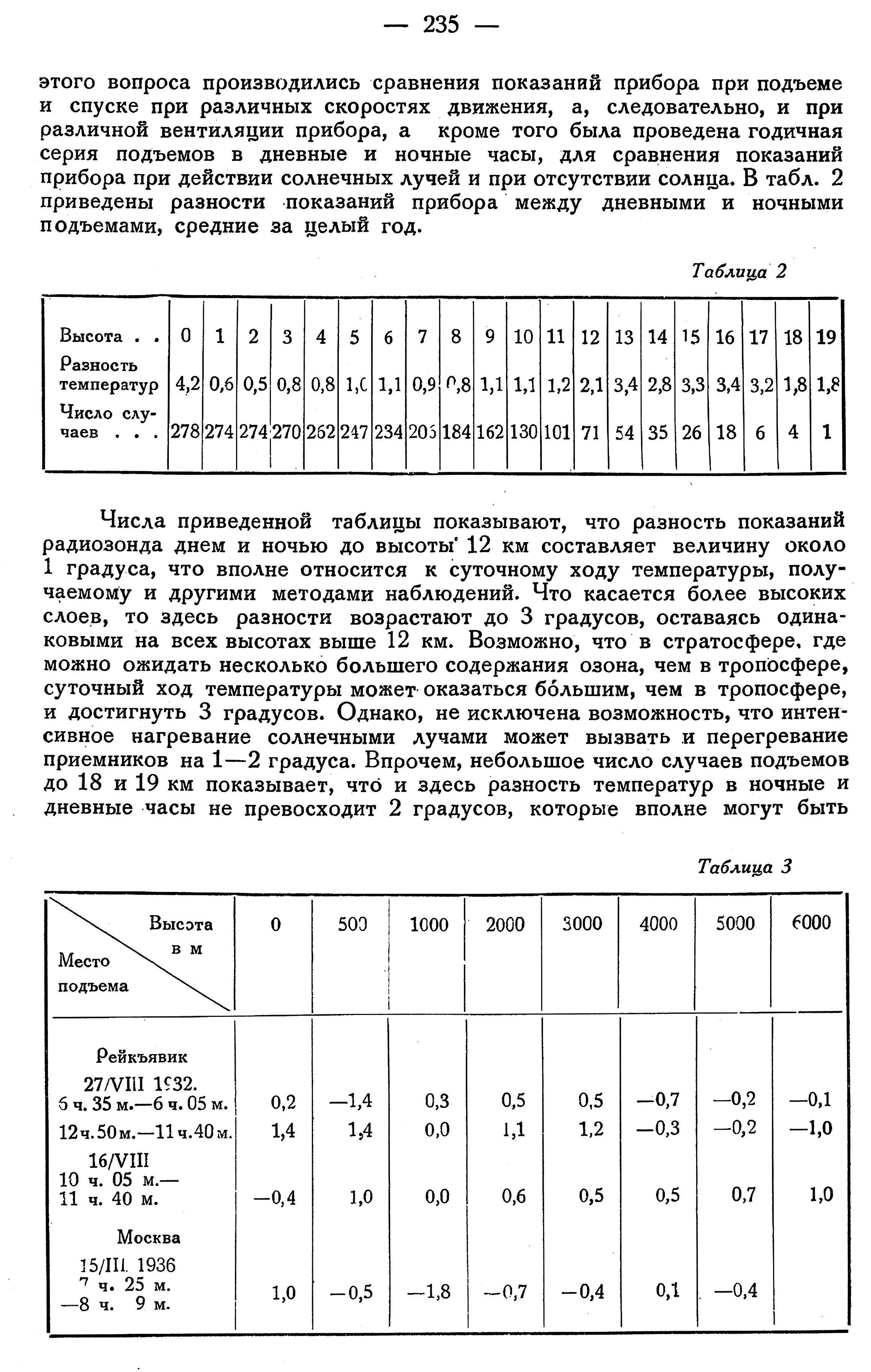 Все подъемы производились в дневные часы. Так как для самолетных метеорографов вопрос о влиянии солнечных лучей не может возникнуть вследствие большой скорости движения,то сходимость показаний служит определенным указанием на правильность показаний радиозонда. В табл. 3 приведены разности показаний радиозонда и самолетного метеорографа. Знак минус указывает на то,что температура по самолетному метеорографу оказалась выше,чем по радиозонду.