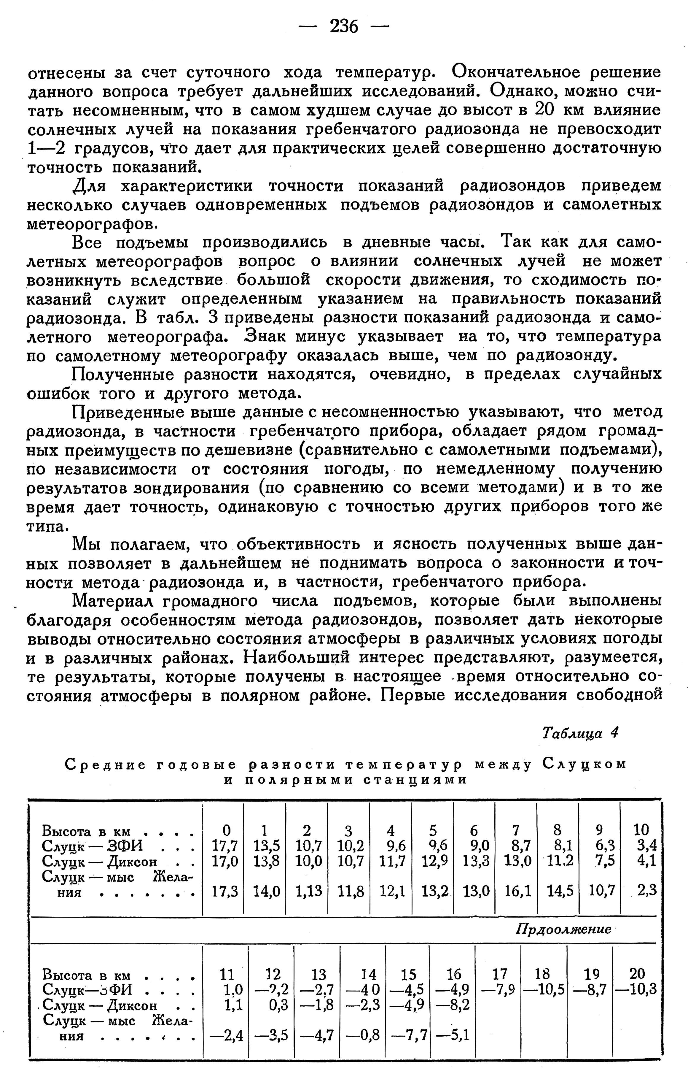 атмосферы во время полярной ночи были произведены автором еще в 1931 г. в с. Полярном (Мурман),где было произведено 9 зондировок,из которых одна дала высоту стратосферы. После этих подъемов мы имеем много наблюдений на Земле Франца—Иосифа,о. Диксона,мысе Желания и др. Для характеристики температурного режима полярной атмосферы представляет наибольший интерес сравнение температур над полярными и более южными станциями в различное время года. В табл. 4 приведены средние годовые разности,полученные по зондировкам в одни и те же дни на различных станциях полярного бассейна и в Институте аэрологии в Слуцке.