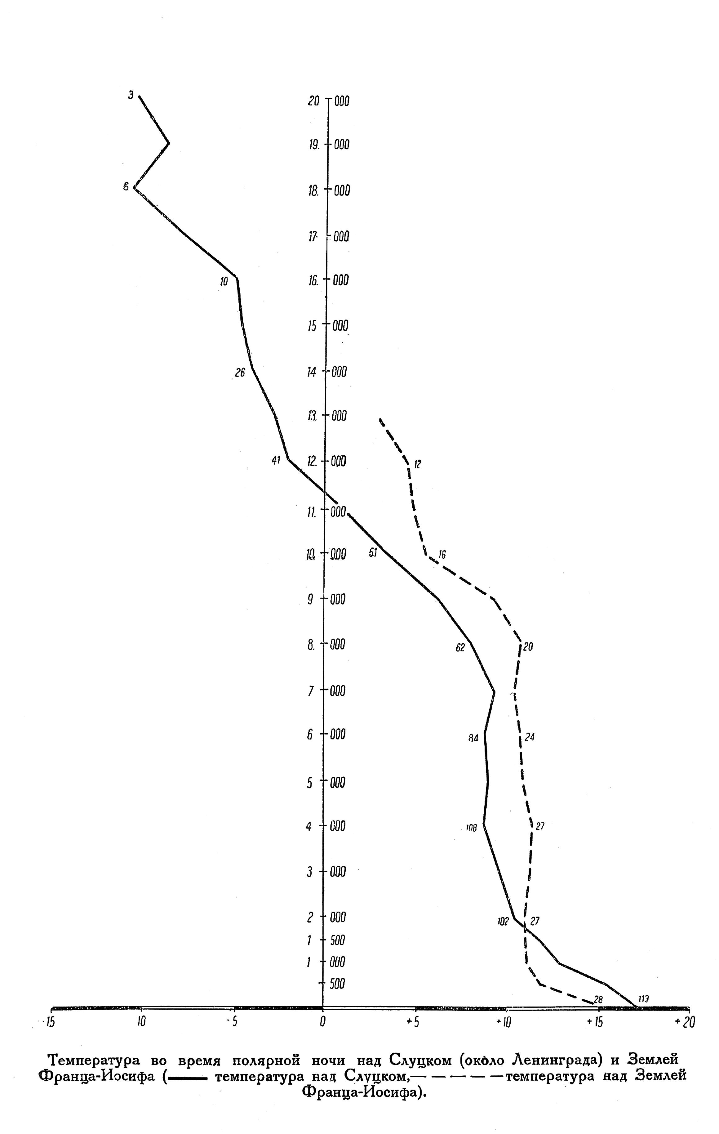 Температура во время полярной ночи над Слуцком (около Ленинграда) и Землей Франца—Иосифа (— температура над Слуцком,----- температура над Землей Франца—Иосифа).