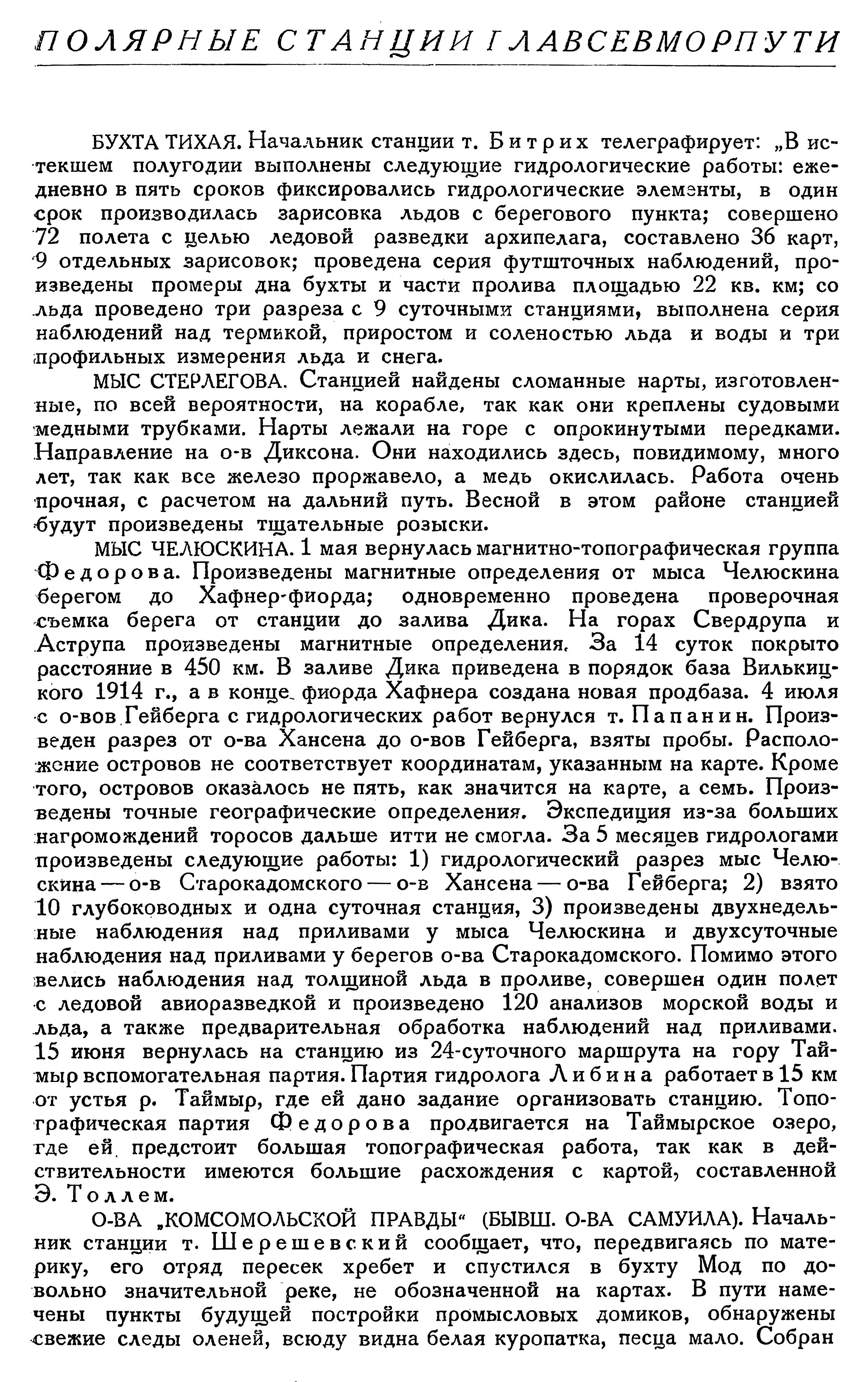 МЫС ШМИДА. Выполнена тридцатидвухсуточная серия ежечасных футшточных наблюдений. В феврале был установлен мареограф, который работал бесперебойно до конца апреля. Произведена съемка и составлены планы трех бухт в районе мыса Шмидта. Промеры в этих бухтах были сделаны еще осенью.