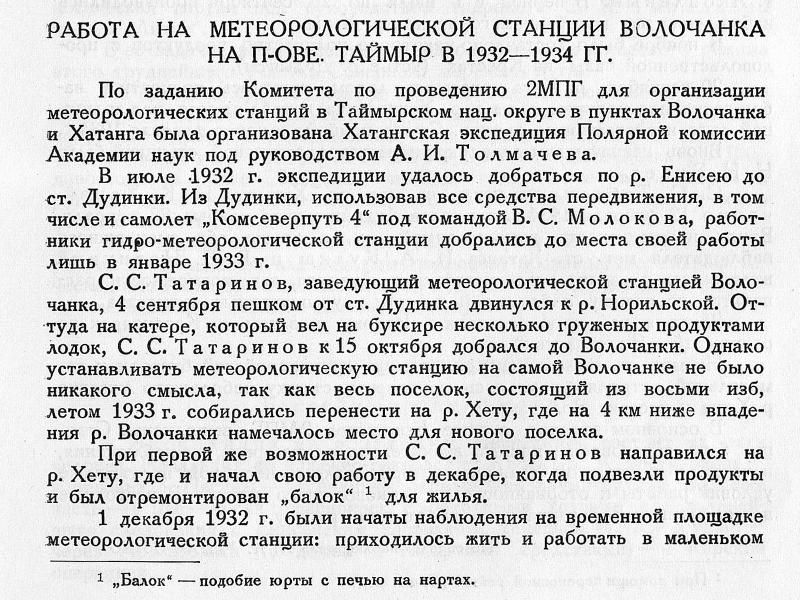 По заданию Комитета по проведению 2МПГ для организации метеорологических станций в Таймырском нац. округе в пунктах Волочанка и Хатанга была организована Хатангская экспедиция Полярной комиссии Академии наук под руководством А. И. Толмачева.