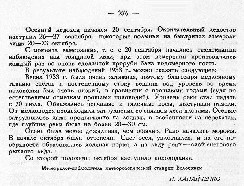 Наблюдения над гидрологическим режимом р. Хеты в 1933 г. производились сотрудниками метеорологической станции Волочанки С. С. Татариновым и Н. К. Ханайченко. Общие наблюдения велись на участке реки от устья р. Волочанки вниз до мыса Волочанского. Наблюдения над колебанием горизонтов воды в реке и над толщиной льда производились раз в сутки, в 7 ч. 15 м. по среднему местному времени, точас же после наблюдений на метеорологической площадке, у метеорологической станции, где в 1934 г. установлены Гидрографической Экспедицией Главсевморпути астропункт и навигационный знак.