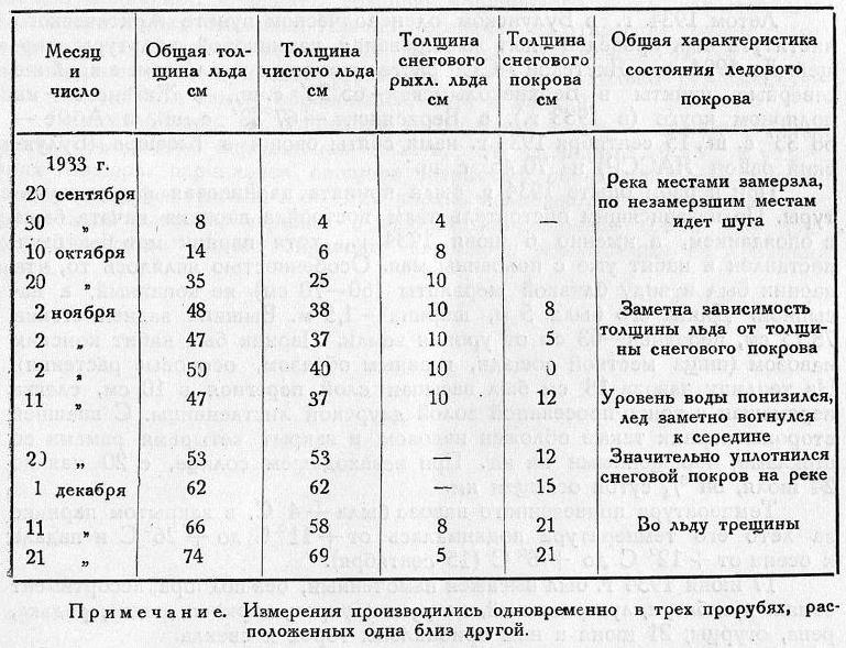 Средняя толщина льда к концу зимы 1932—33 г. была равна 105 см, средняя толщина снегового покрова по данным снегосъемки на земле — 64 см, на реке в среднем не более 20—25 см, так как сильные ветры с Е и W в течение всей зимы сдували снег к берегам, образуя там завалы с застругами причудливой формы.
