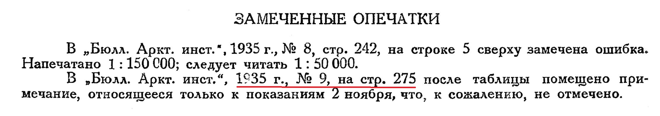 В „Бюлл. Аркт. инст.", 1935 г., № 9, на стр. 275 после таблицы помещено примечание, относящееся только к показаниям 2 ноября, что, к сожалению, не отмечено.