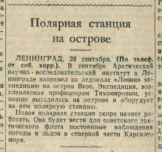 Полярная станция на о.Визе//Вечерняя Москва 2 октября 1945 №232