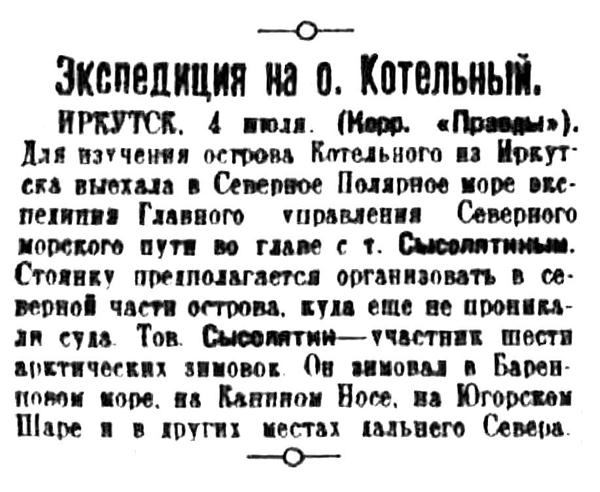 Для изучения острова Котельного из Иркутска выехала в Северное Полярное море экспедиция Главного управления Северного морского пути во главе с т. Сысолятиным. Стоянку предполагается организовать в северной части острова, куда еще не проникали суда. Тов. Сысолятин — участник шести арктических зимовок. Он зимовал в Баренцовом море, на Канином Носе, на Югорском Шаре и в других местах дальнего Севера.