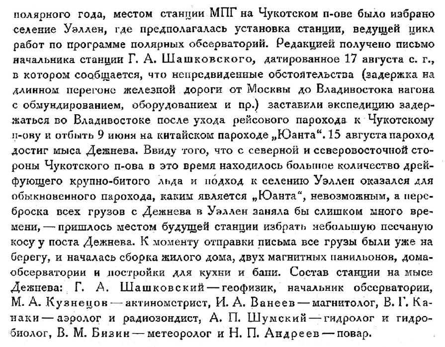 Согласно советской программе проведения Второго Международного полярного года, местом станции МПГ на Чукотском п-ове было избрано селение Уэллен, где предполагалась установка станции, ведущей цикл работ по программе полярных обсерваторий. Редакцией получено письмо начальника станции Г. А. Шашковского, датированное 17 августа с. г., в котором сообщается, что непредвиденные обстоятельства (задержка на длинном перегоне железной дороги от Москвы до Владивостока вагона с обмундированием, оборудованием и пр.) заставили экспедицию задержаться во Владивостоке после ухода рейсового парохода к Чукотскому п-ову и отбыть 9 июня на китайском пароходе „Юанта“. 15 августа пароход достиг мыса Дежнева. Ввиду того, что с северной и северовосточной стороны Чукотского п-ова в это время находилось большое количество дрейфующего крупно-битого льда и подход к селению Уэллен оказался для обыкновенного парохода, каким является „Юанта", невозможным, а переброска всех грузов с Дежнева в Уэллен заняла бы слишком много времени, — пришлось местом будущей станции избрать небольшую песчаную косу у поста Дежнева. К моменту отправки письма все грузы были уже на берегу, и началась сборка жилого дома, двух магнитных павильонов, дома, обсерватории и постройки для кухни и бани. Состав станции на мысе Дежнева:
