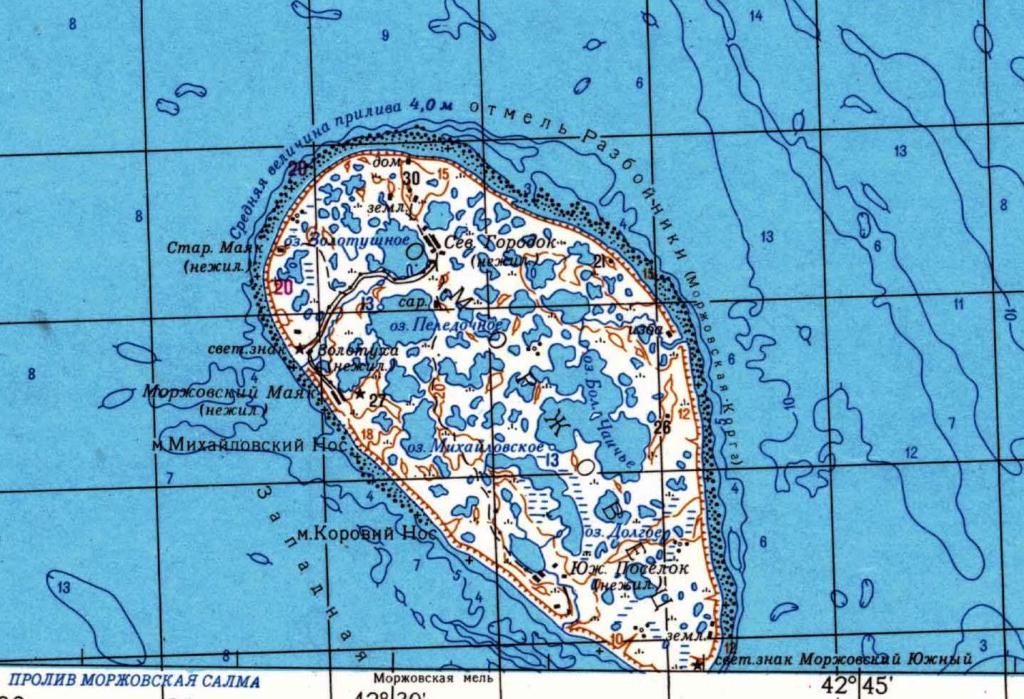 Перед тем, как поехать на остров Моржовец, я хорошо изучил его по картам, в том числе и XVIII и XIX века, но Глухой губы на них не нашел. Не знали такой губы и старожилы маяка. Хотя место около метеостанции наиболее подходящее: здесь и берег более пологий и грунт кремнист.